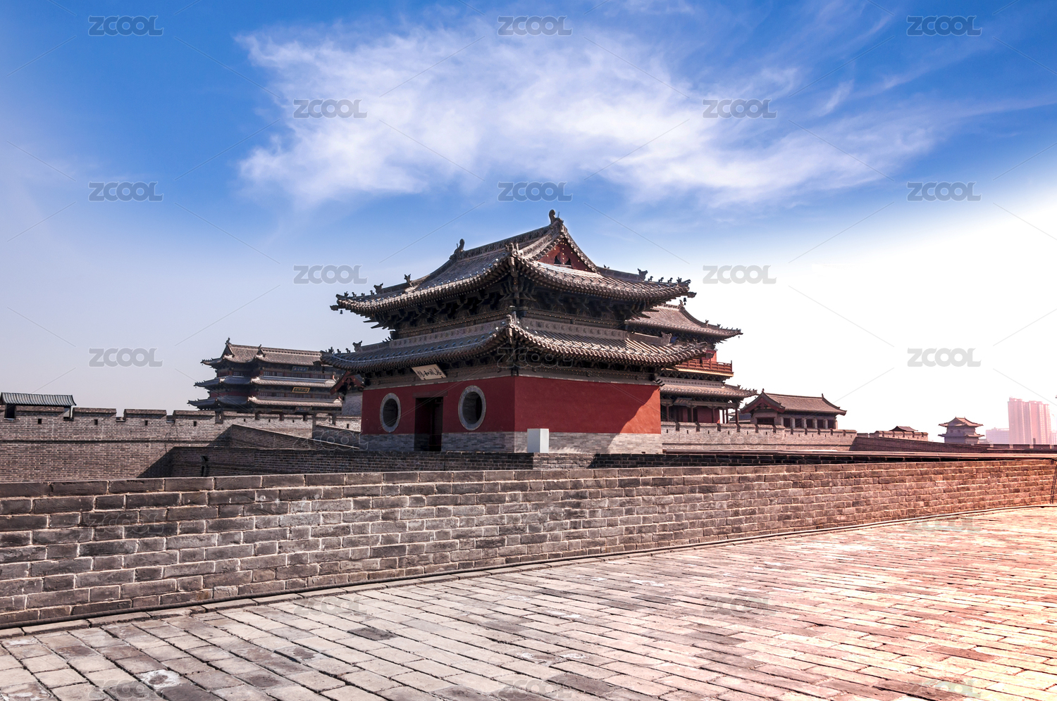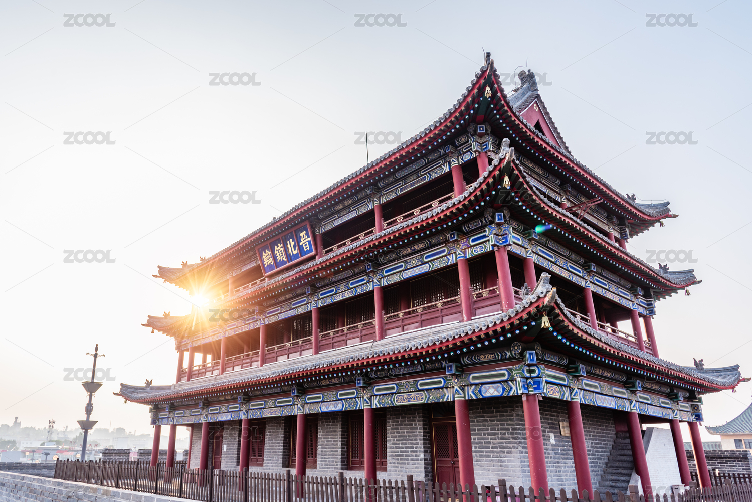 朝霞下的中国山西大同古城城墙古楼建筑城市风光