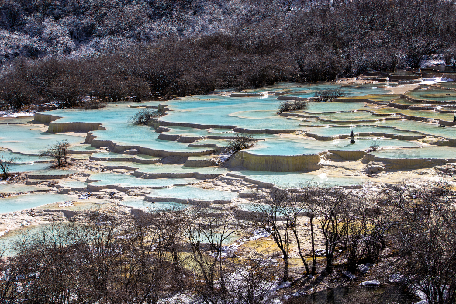 四川阿坝黄龙景区冬日雪后五彩池钙化池