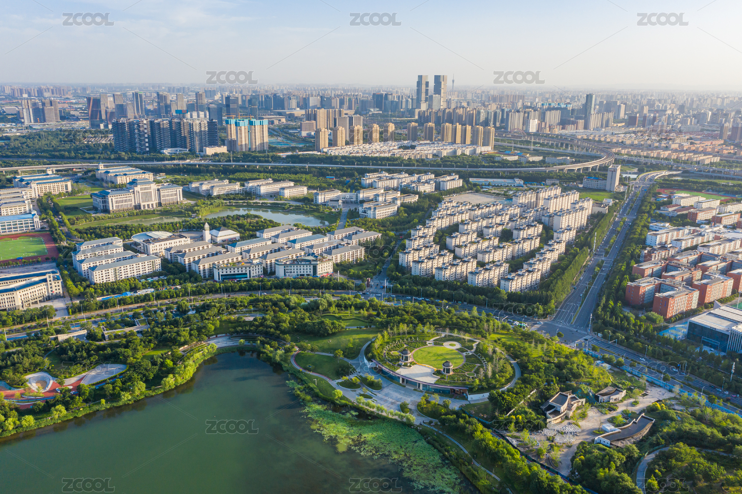 航拍河南郑州中原龙子湖智慧岛双创园区建筑