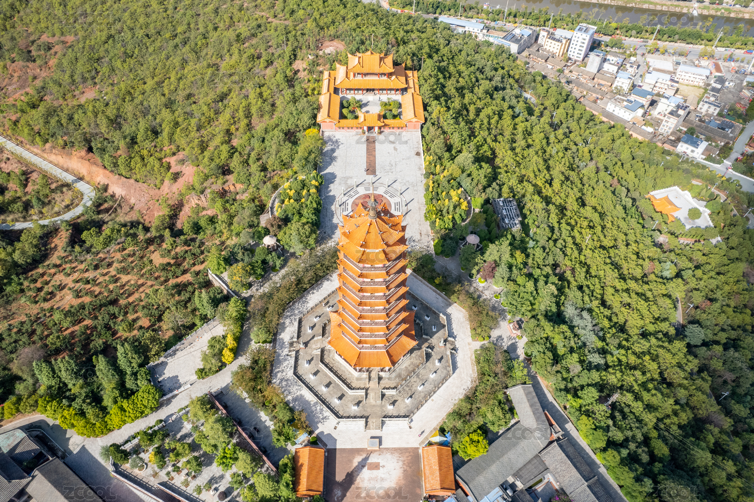中国辽宁锦州凌海九华山公园慈海寺航拍风光