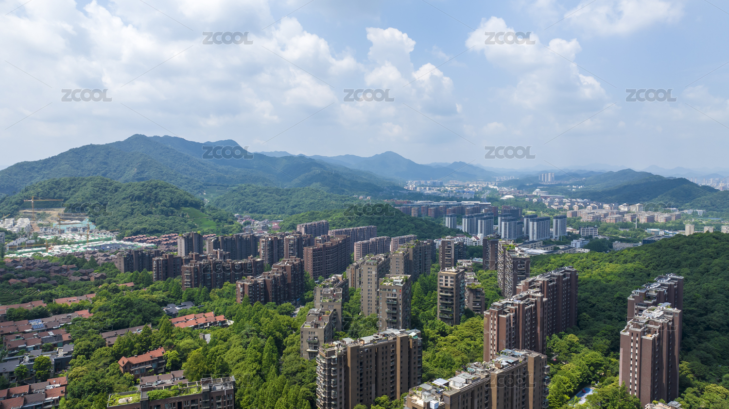 航拍杭州留下西穆坞村屏基山公园与居民区