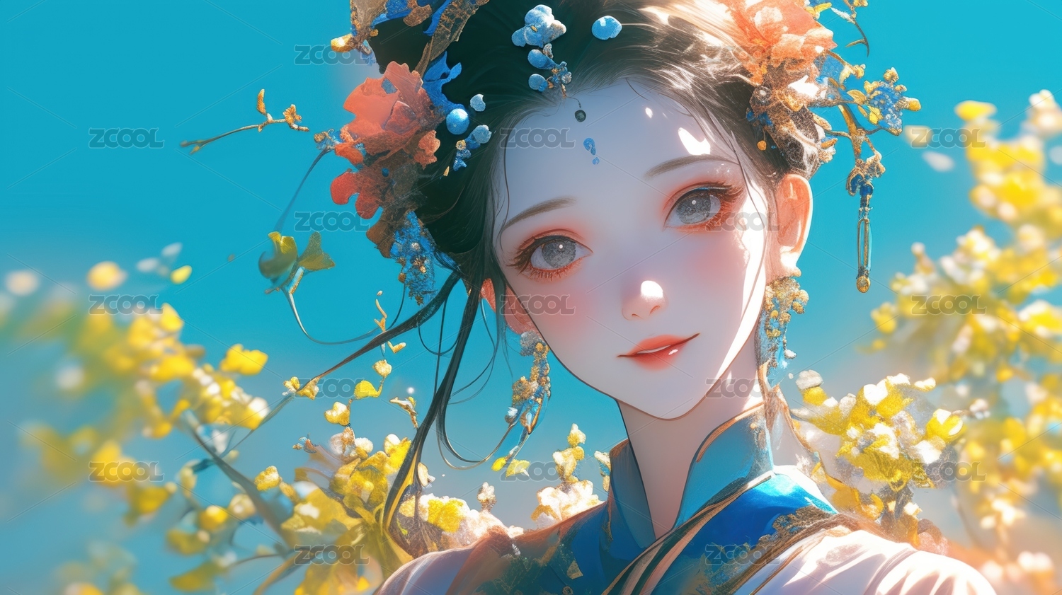 蓝花环绕的古典美人