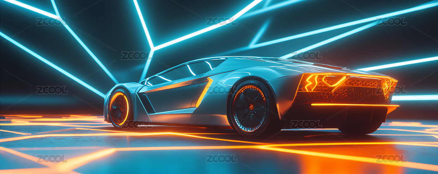 未来科技感十足的汽车在霓虹灯隧道中行驶