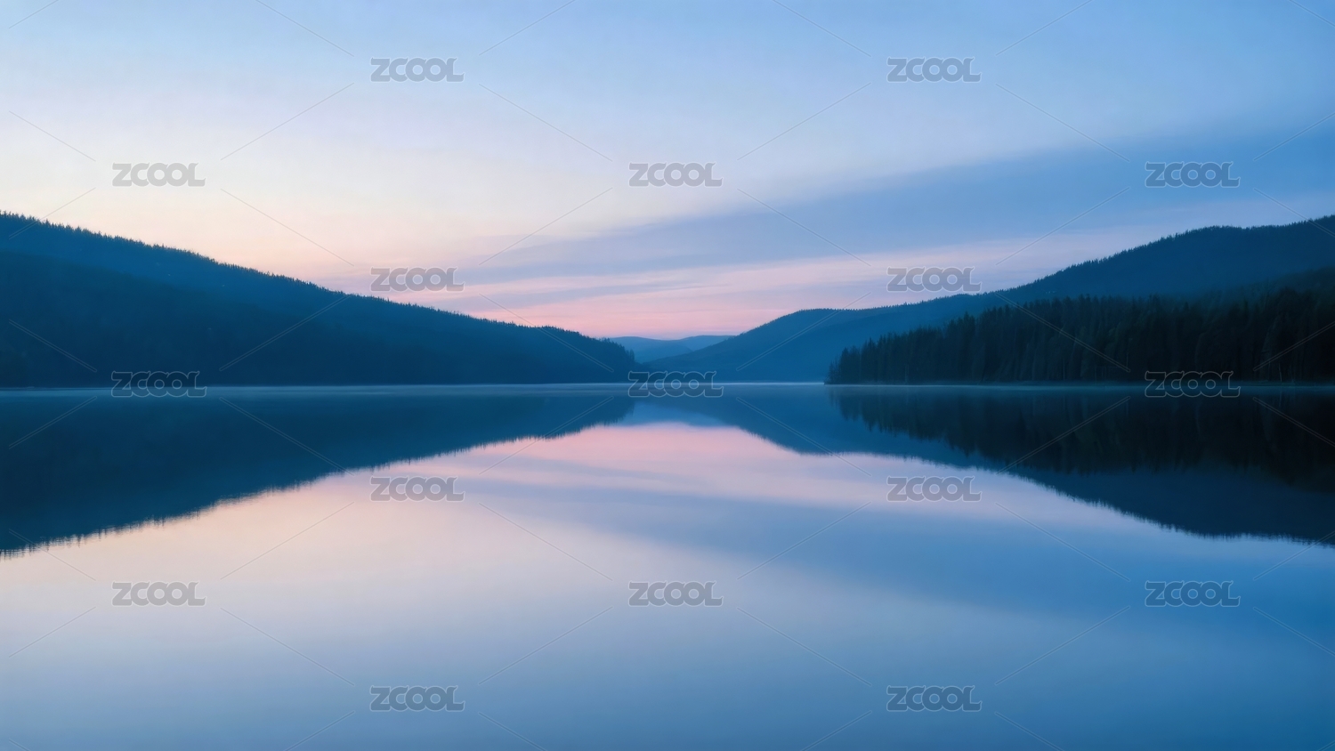 宁静湖面与远山的晨曦倒影