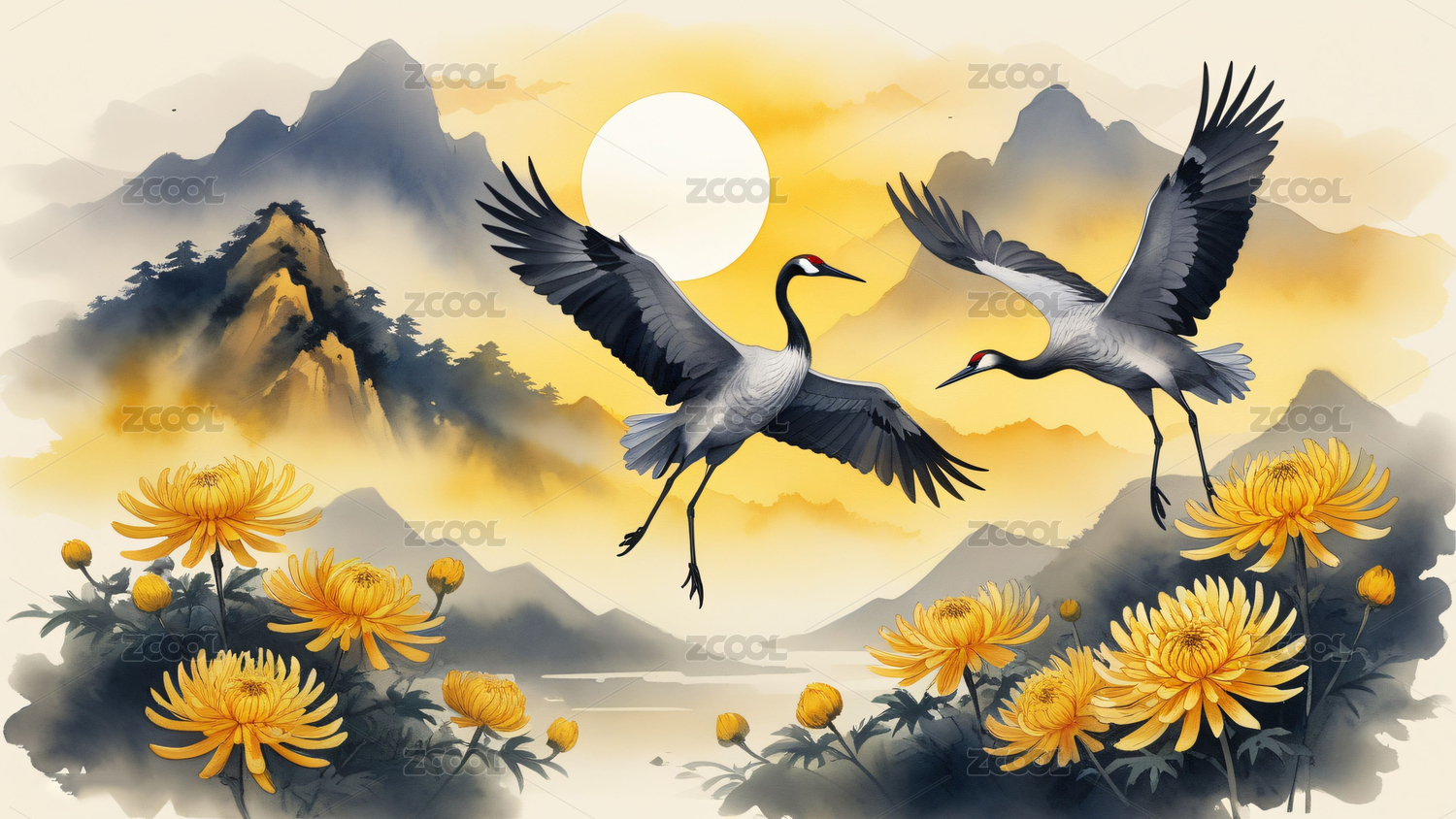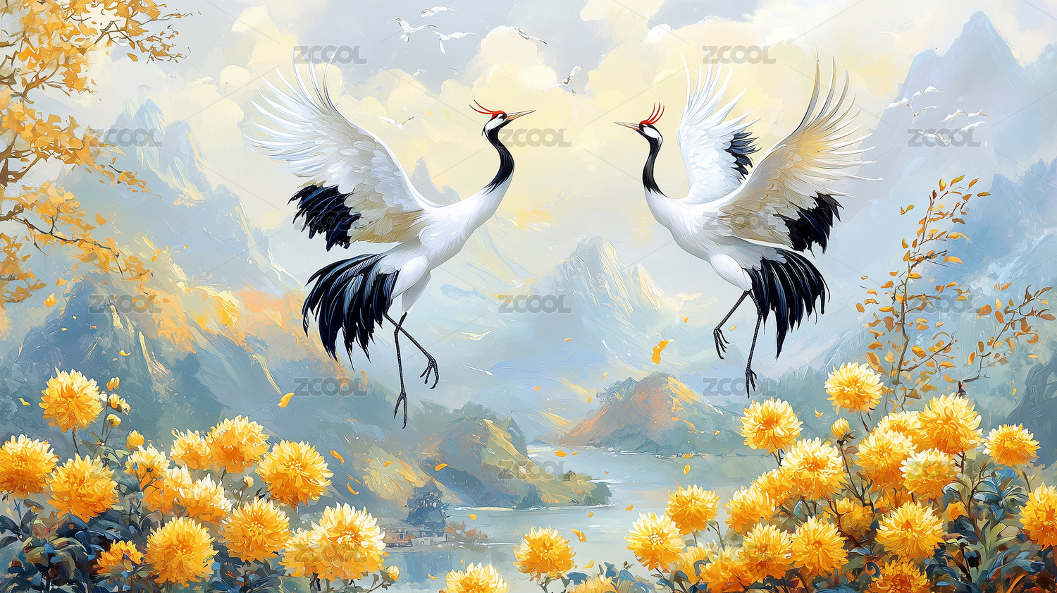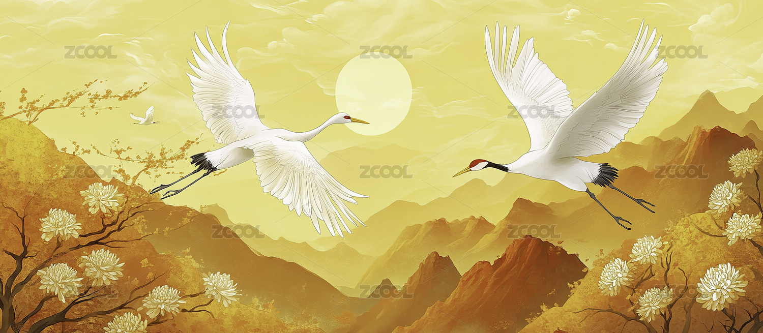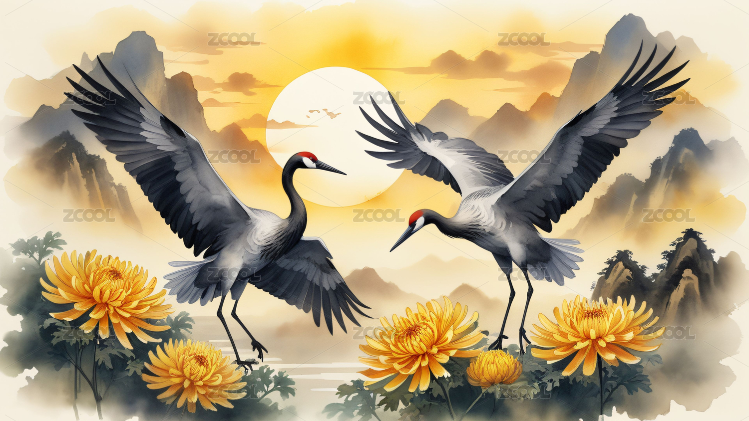 仙鹤迎着落日天空飞翔,伴有金色菊花