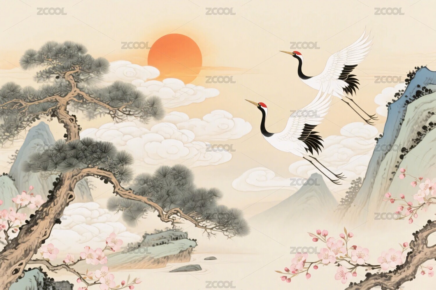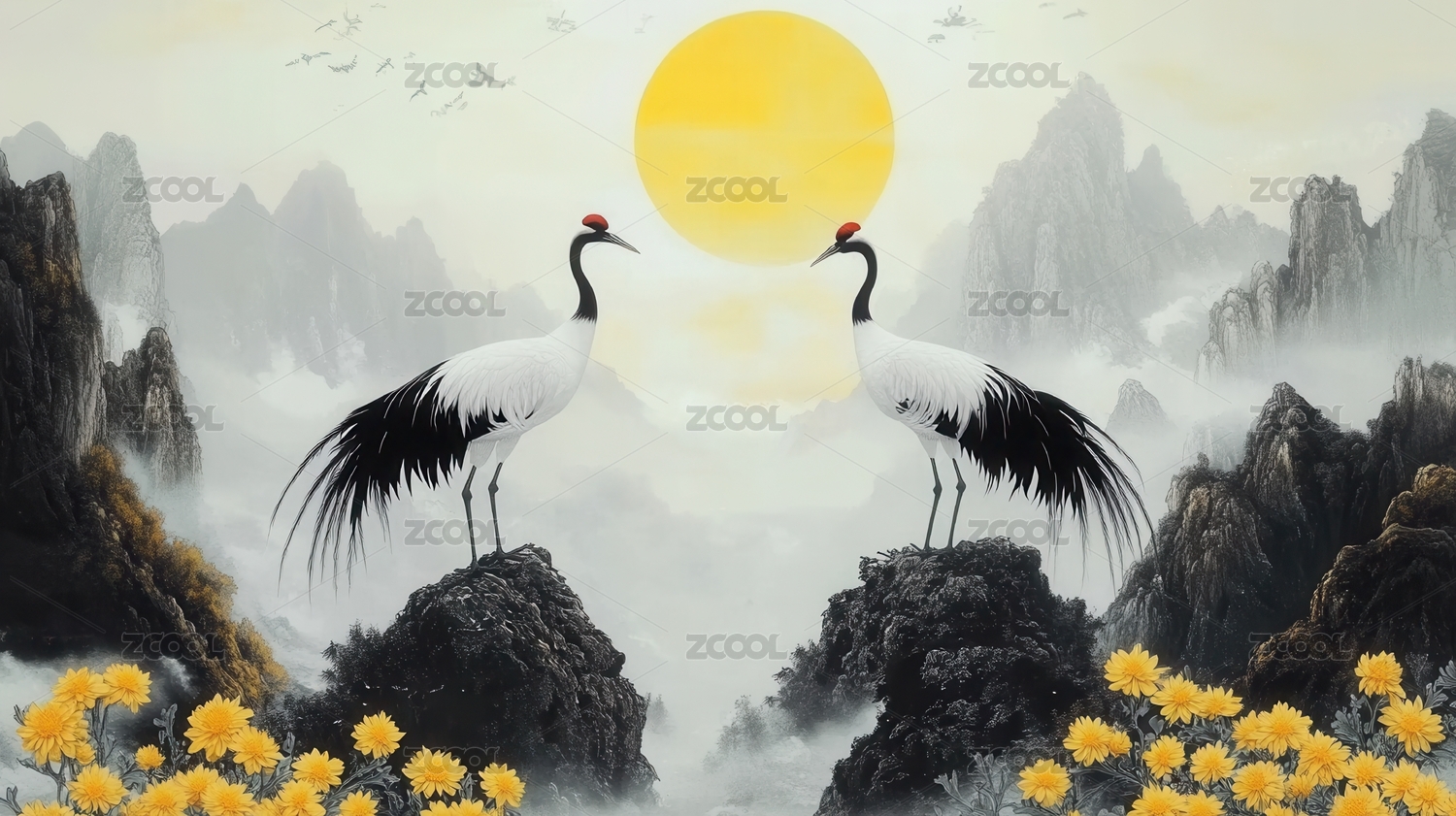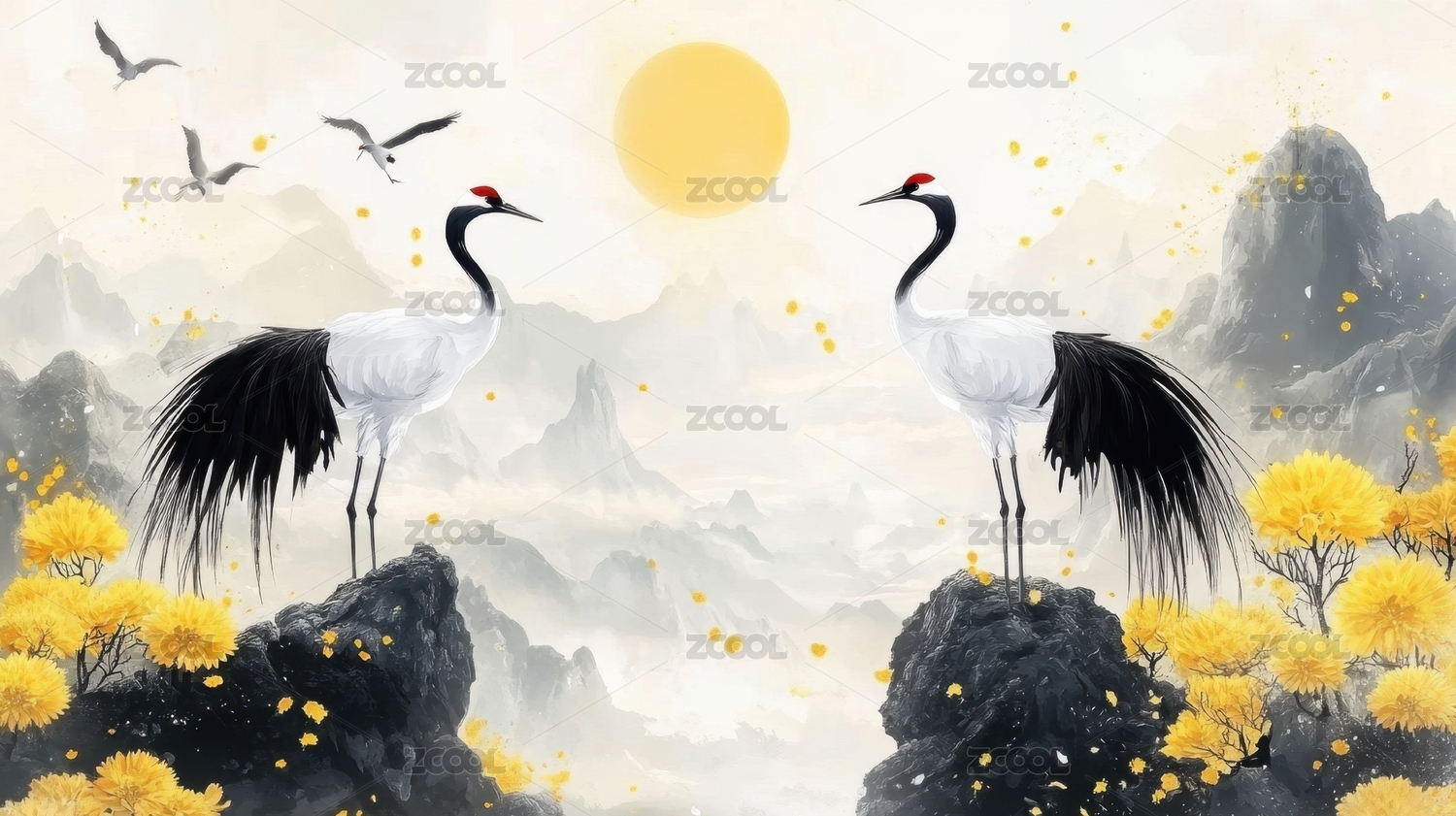 仙鹤迎着落日天空飞翔,伴有金色菊花