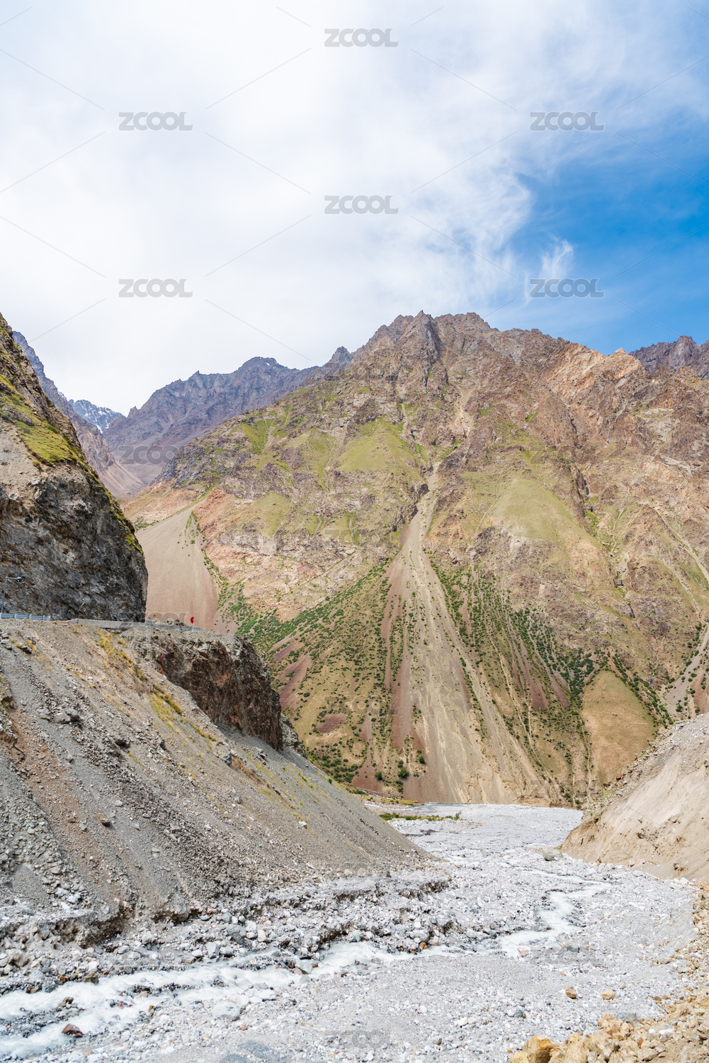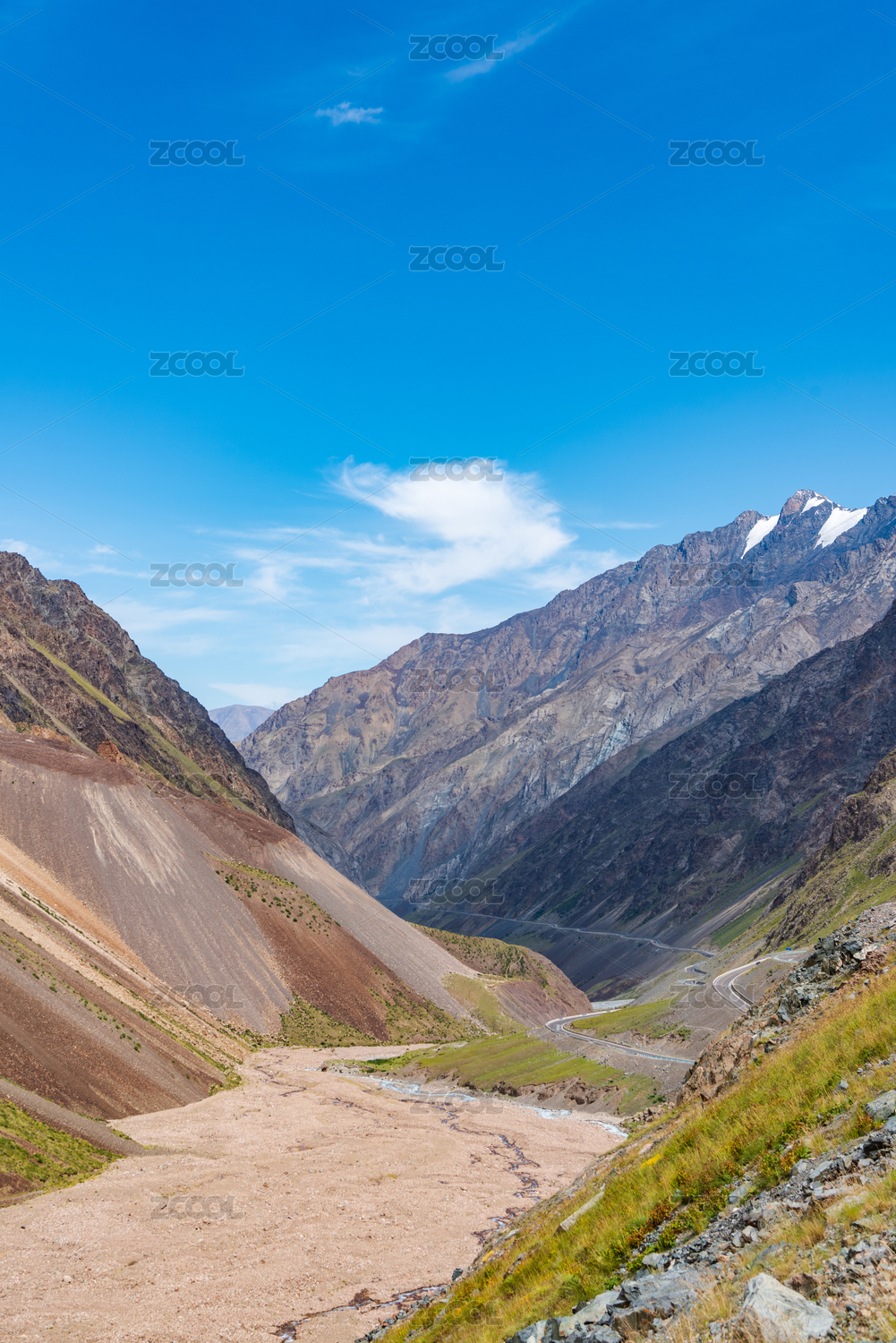 中国新疆夏季蓝天白云下G217独库公路沿途高山戈壁风景