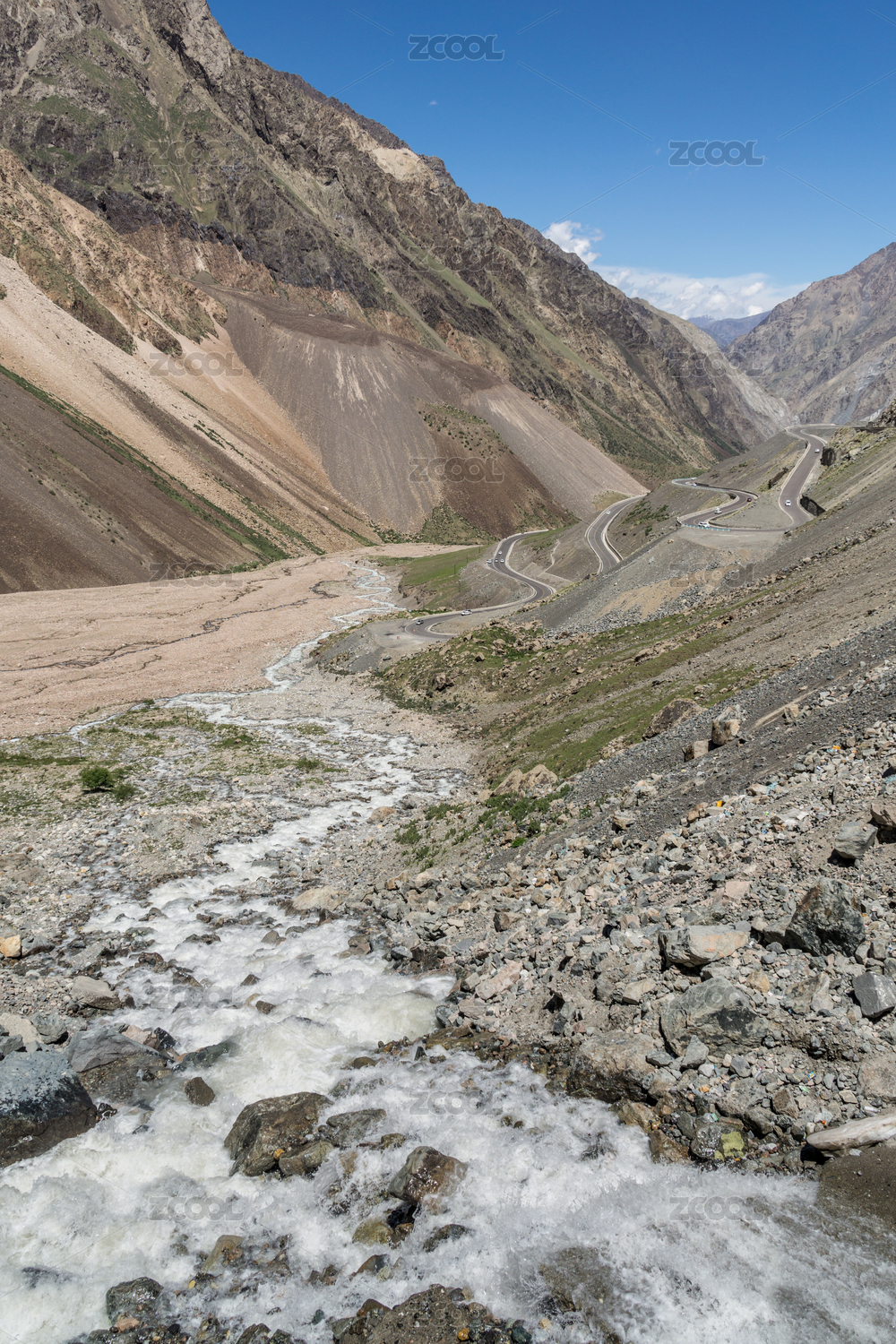中国新疆夏季蓝天白云下高山草原G217独库公路砂石路段