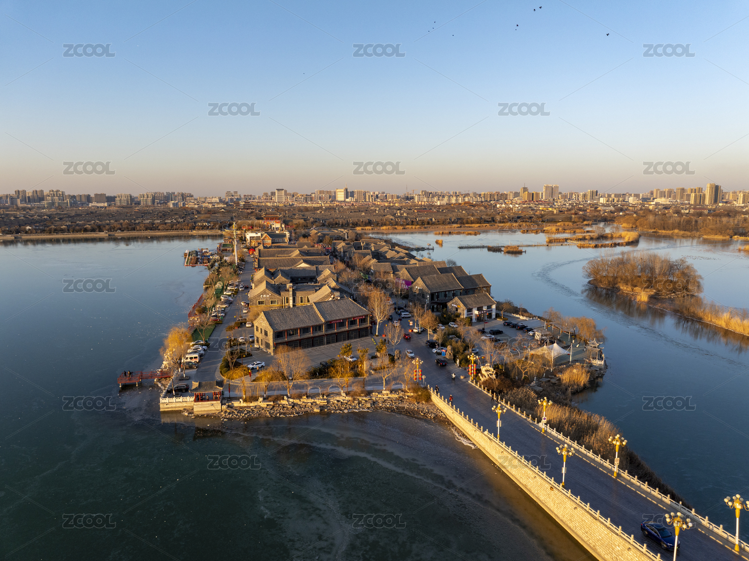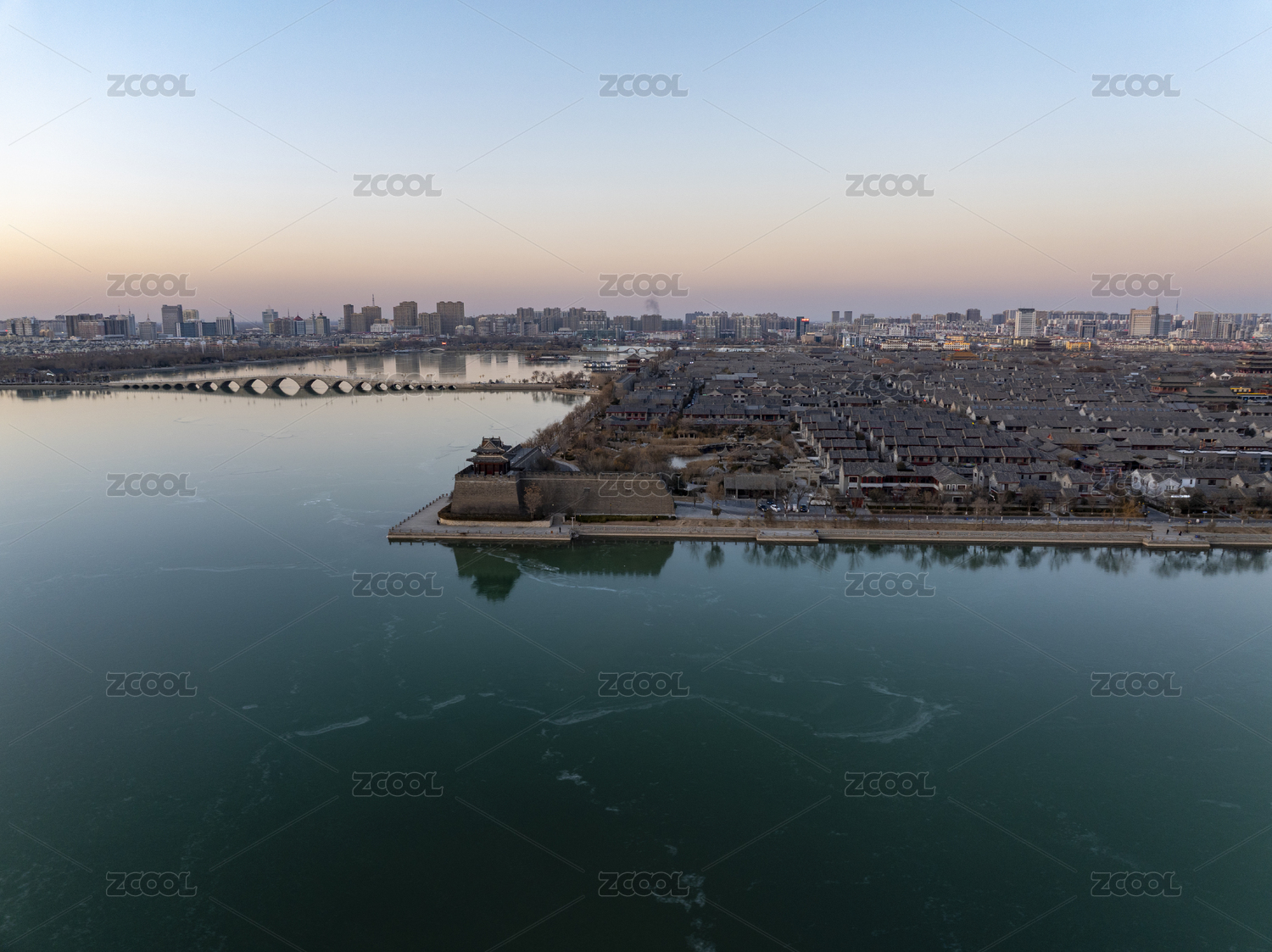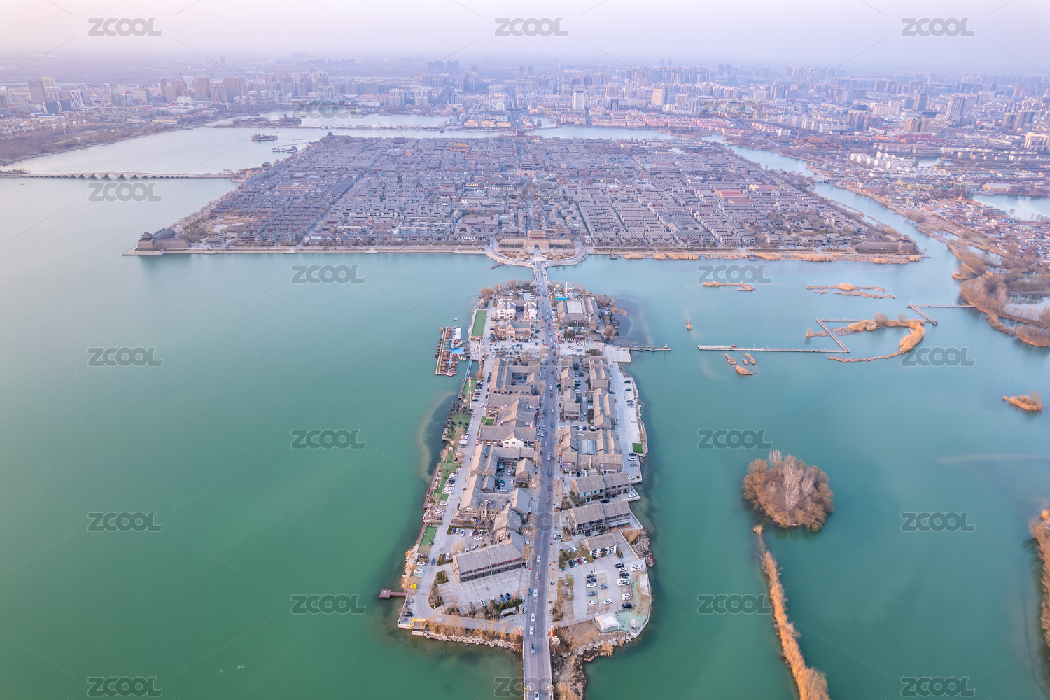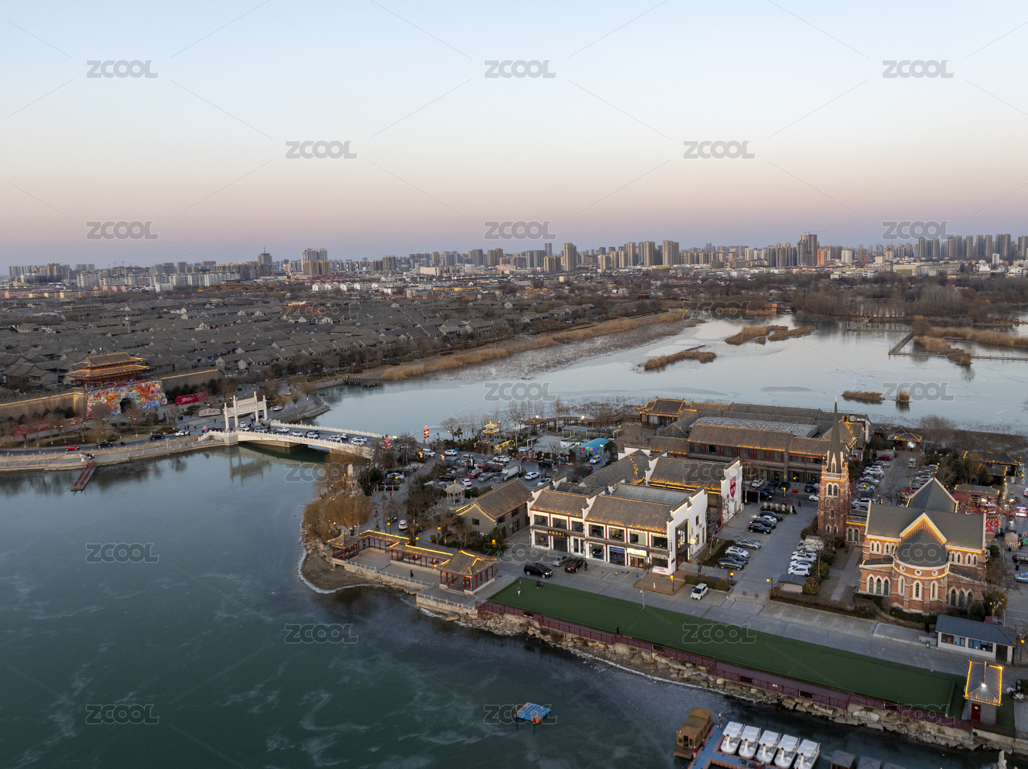 景区,南关岛,航拍,商业街,古街,楼阁,古城,运河,中国,山东