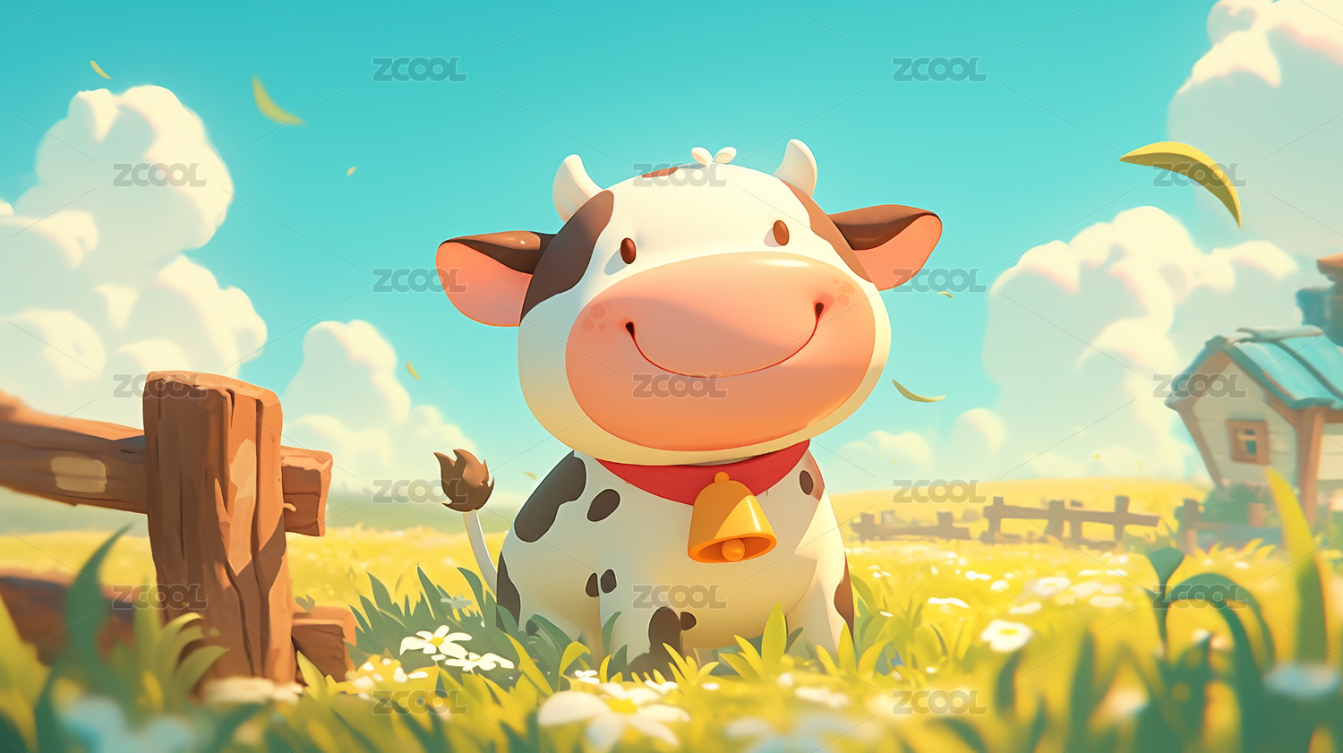 动物,插画,森林,植物,黄色,牛,阳光,奶牛,草原