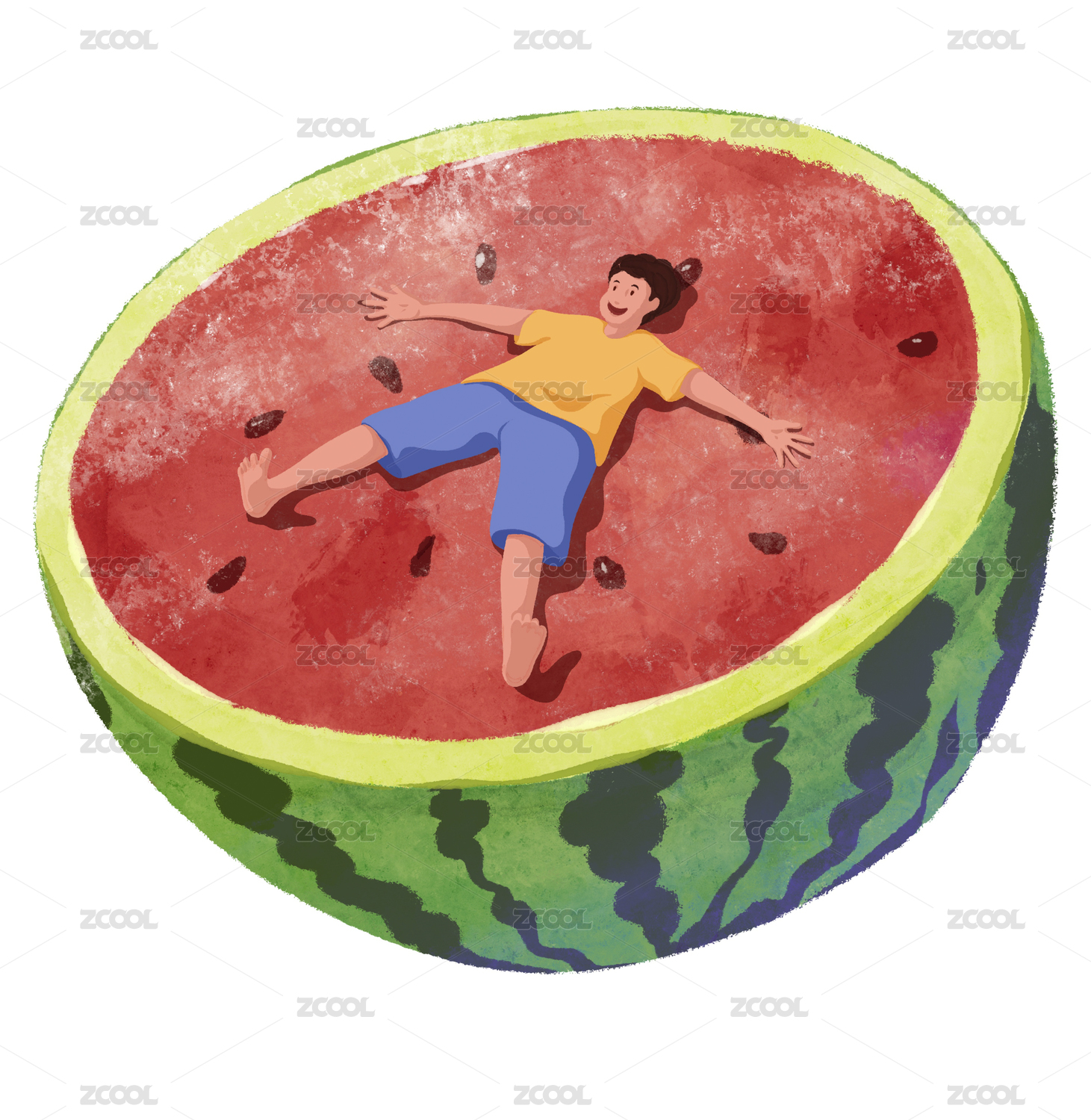 男孩躺在西瓜上插画
