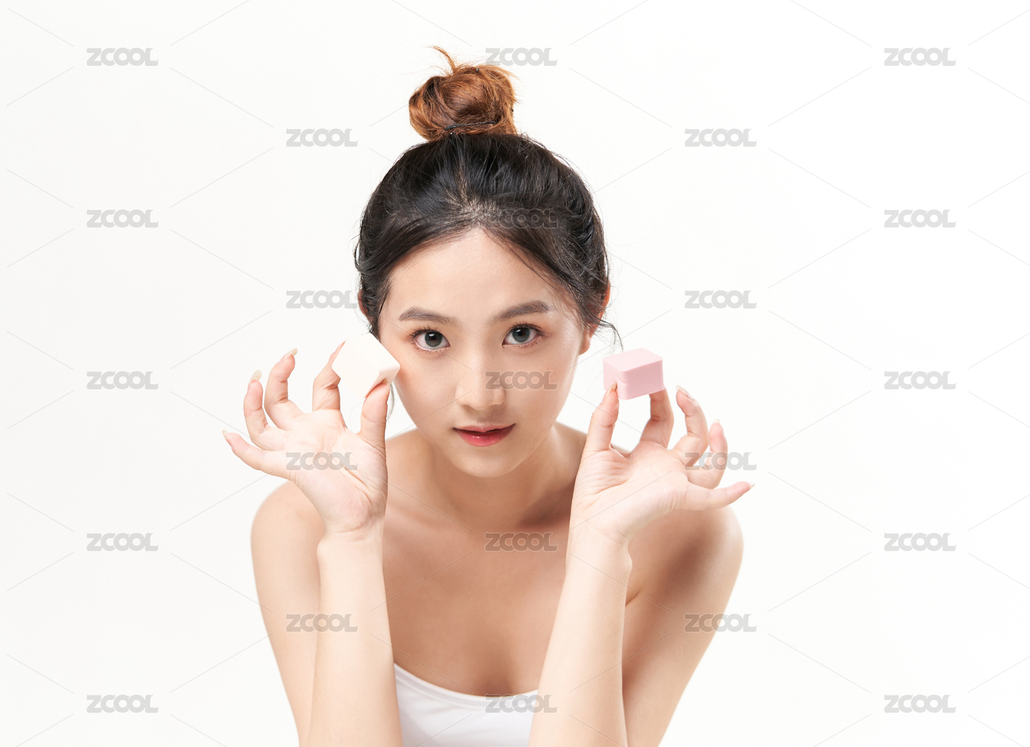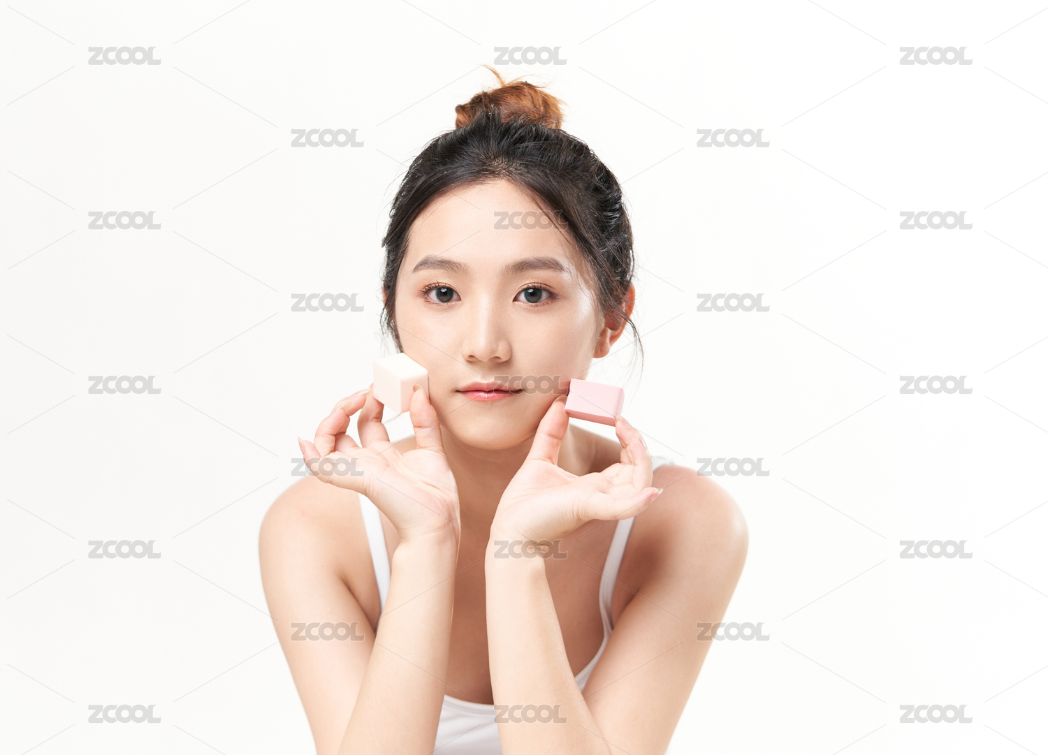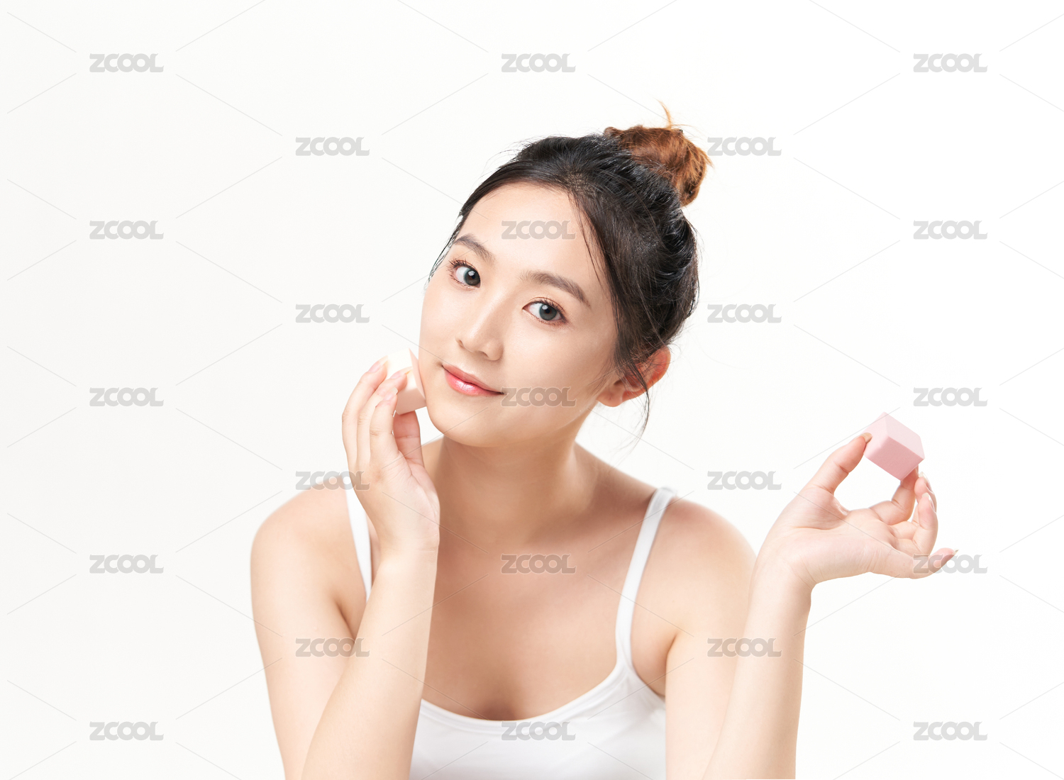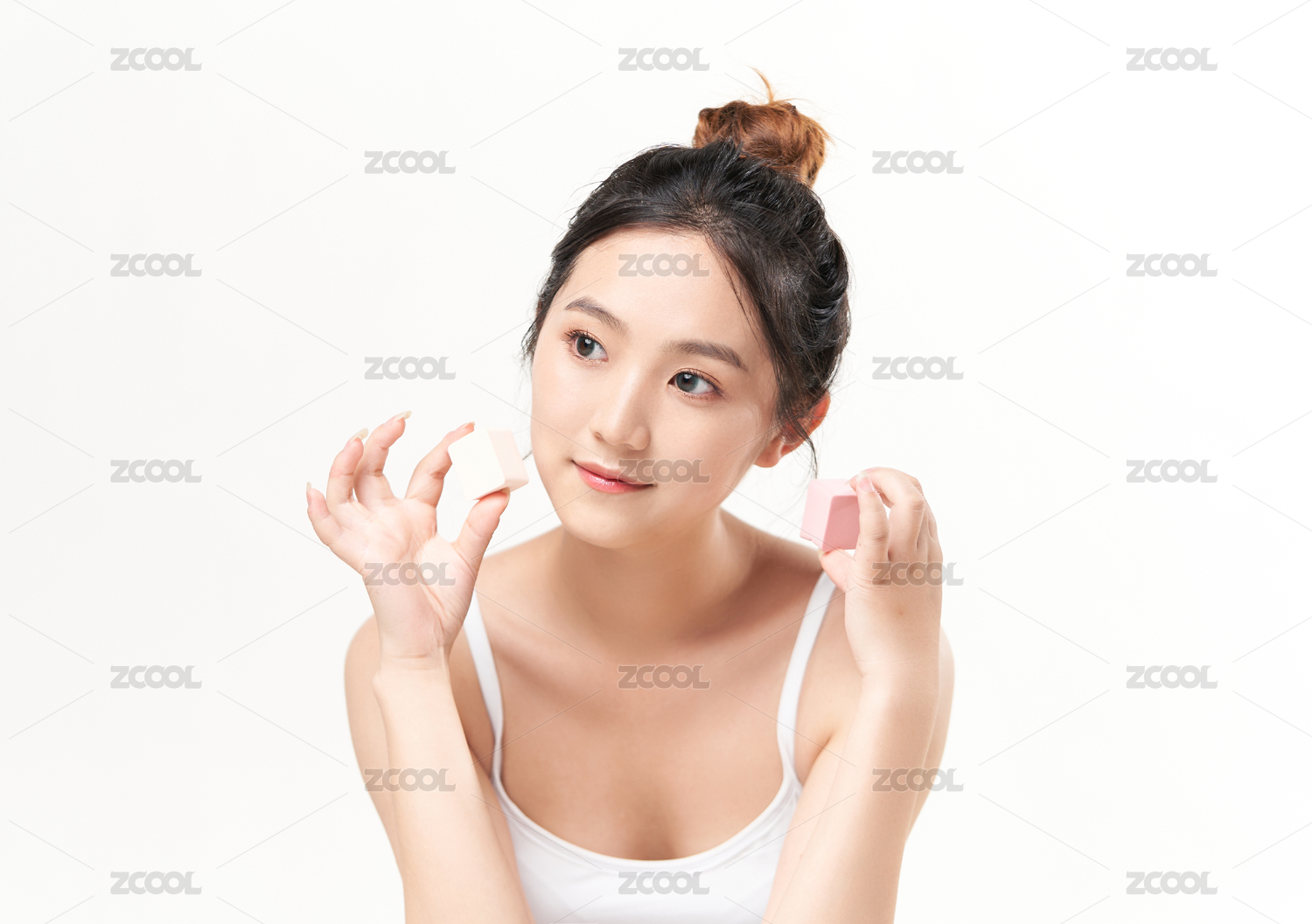 白色背景前手拿美妆蛋的东方美女