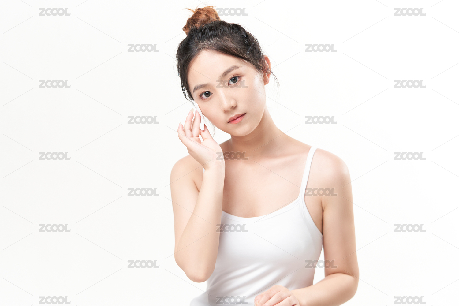 一位正在卸妆的丸子头美女