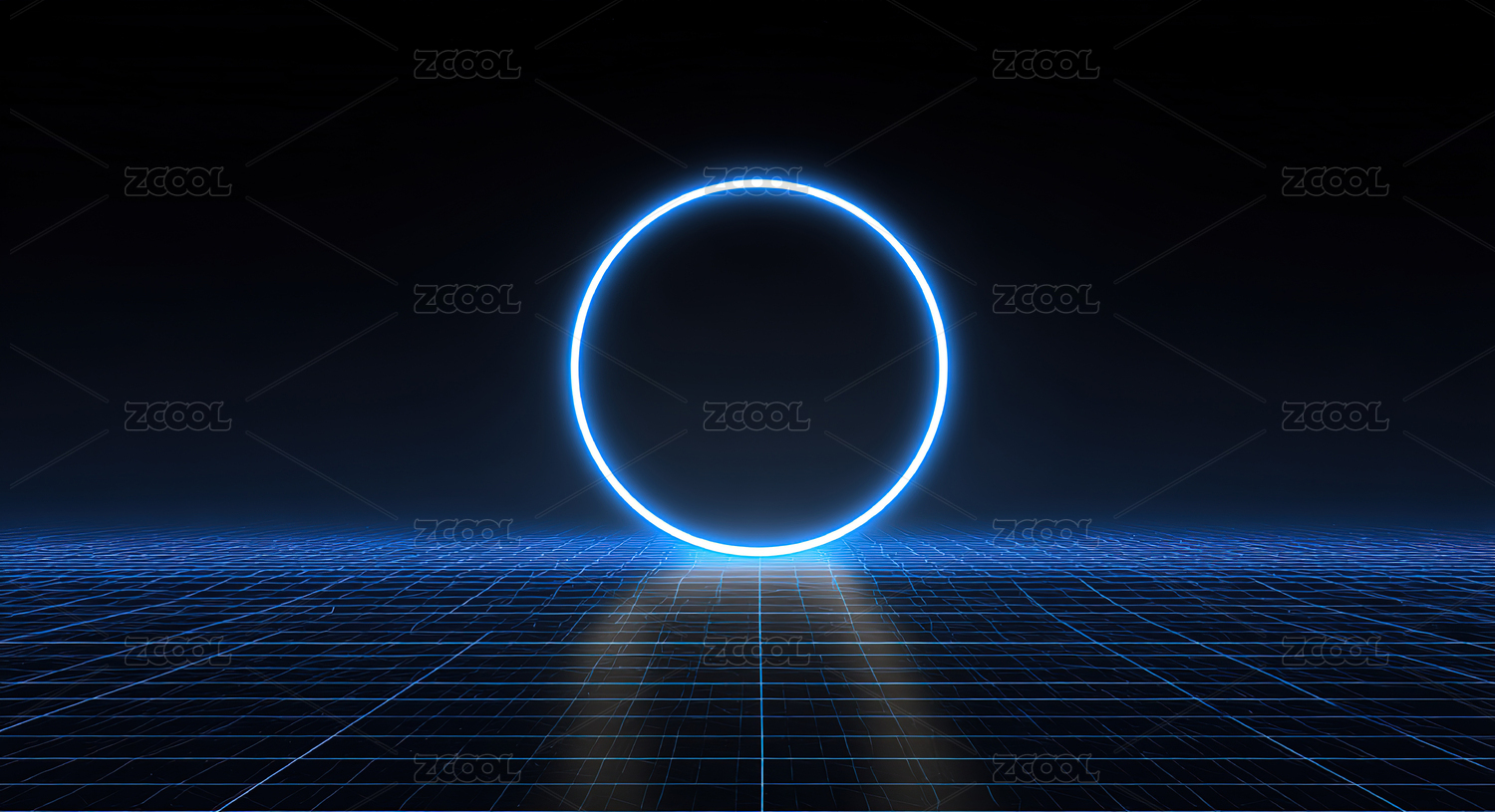 蓝色霓虹圆环与网格地面