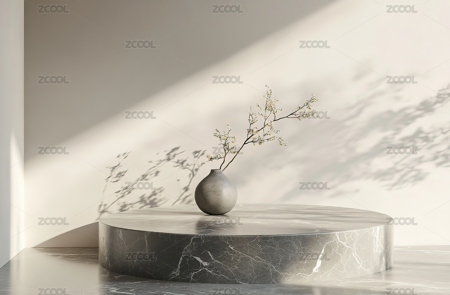 简约阳光洒落的圆形展示台与绿植