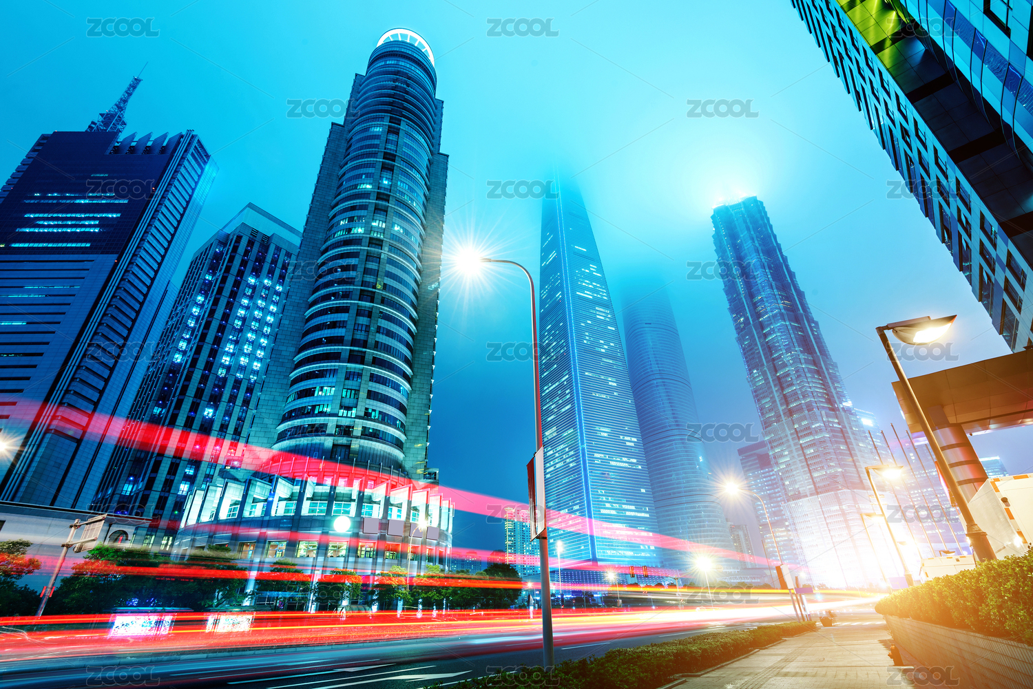 上海陆家嘴金融区现代建筑夜景和城市道路车流光影轨迹