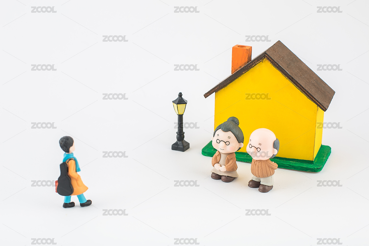 房子前硬币上坐着的人偶模型