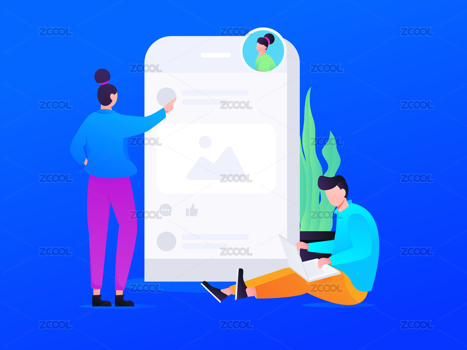 科技感刷朋友圈的女孩与工作的男子共同协作,概念商业扁平矢量插画