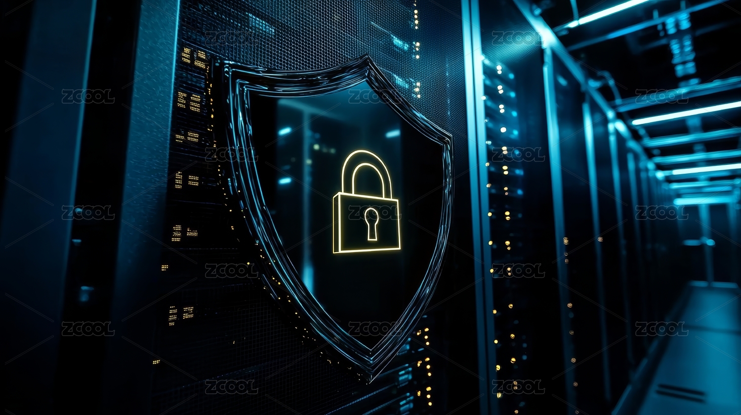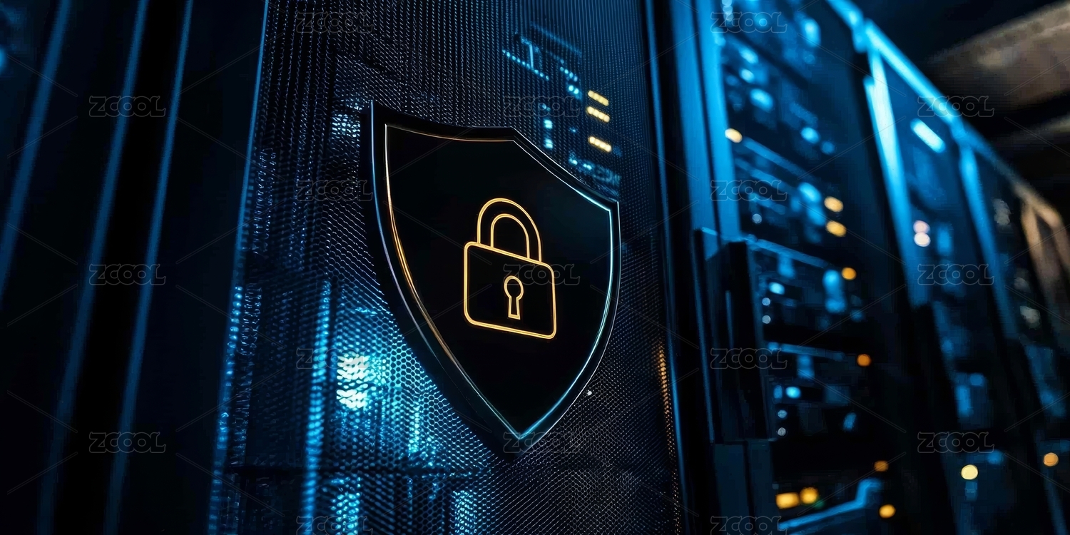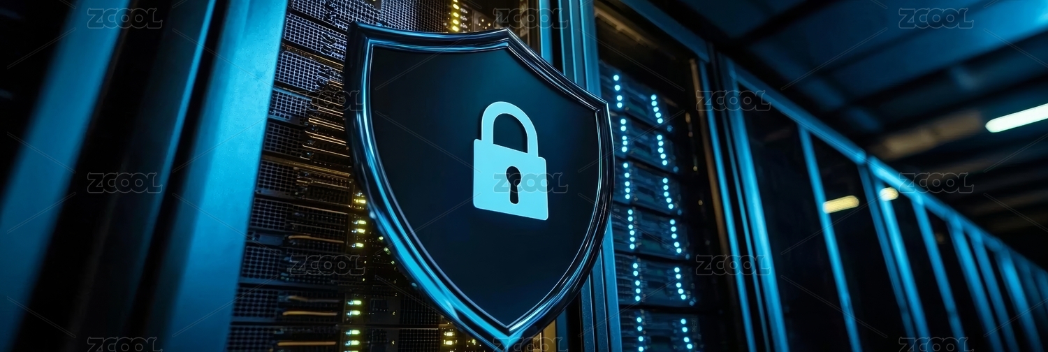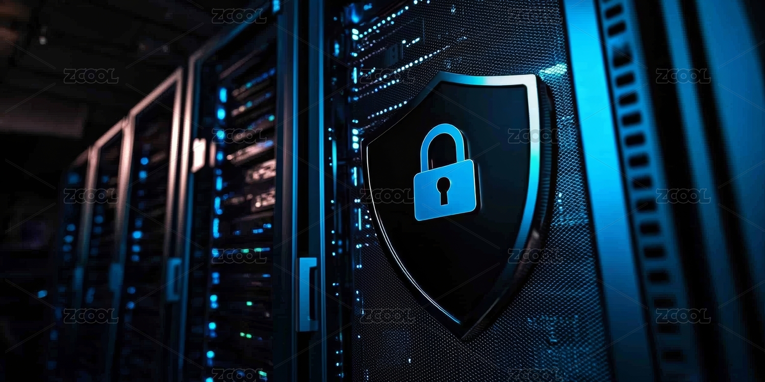 蓝色调盾牌与服务器设备