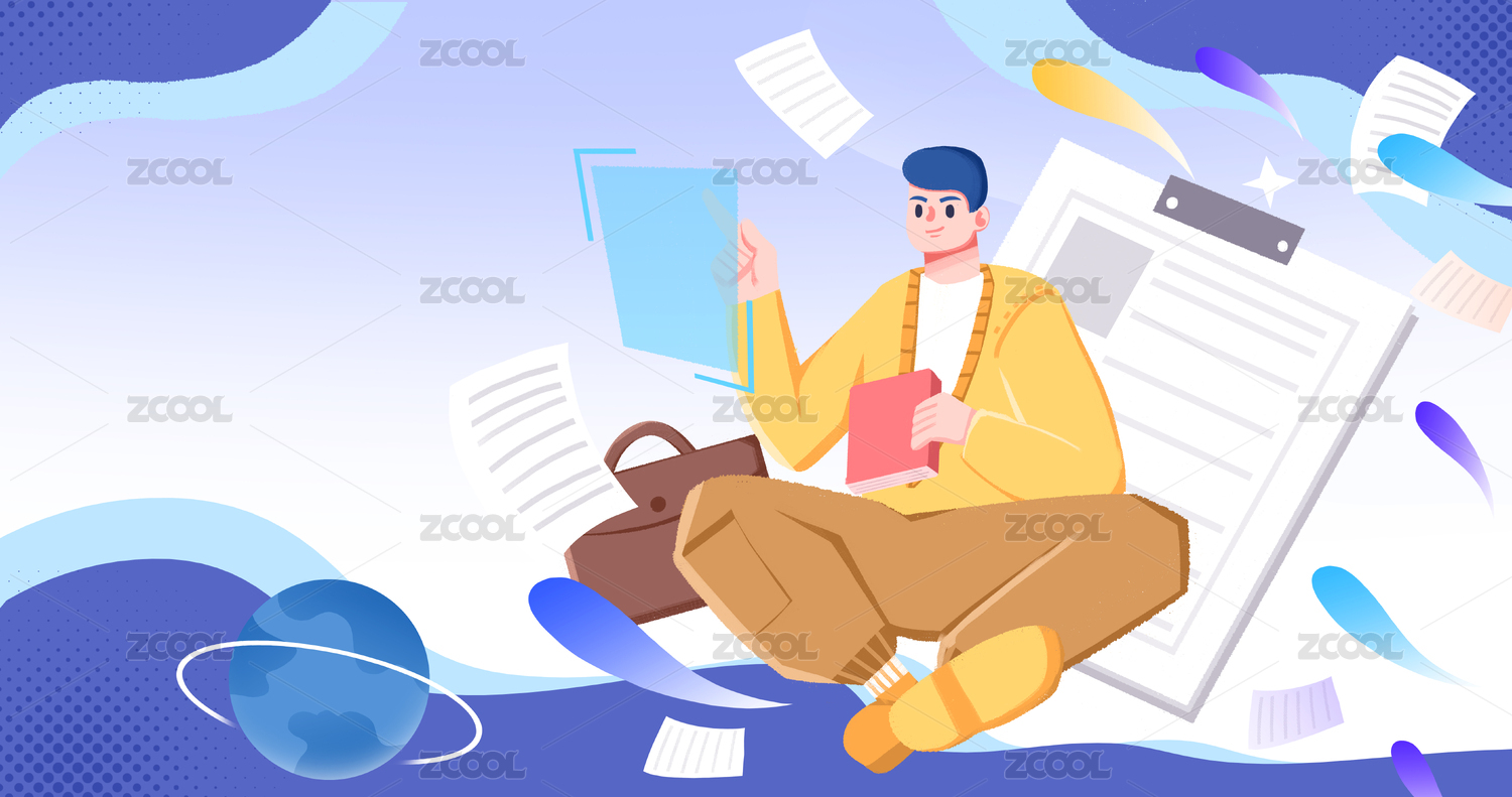 一个男子坐在沙发上居家办公桌子书本矢量插画
