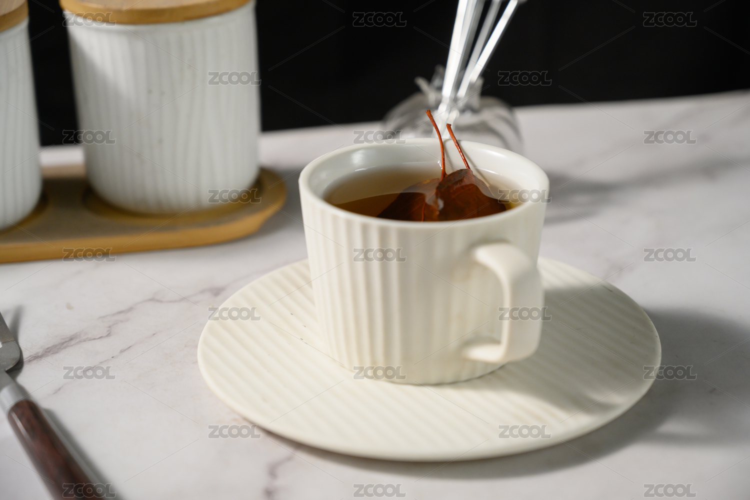 桌面上的盘子里的甘甜可口的山楂叶茶