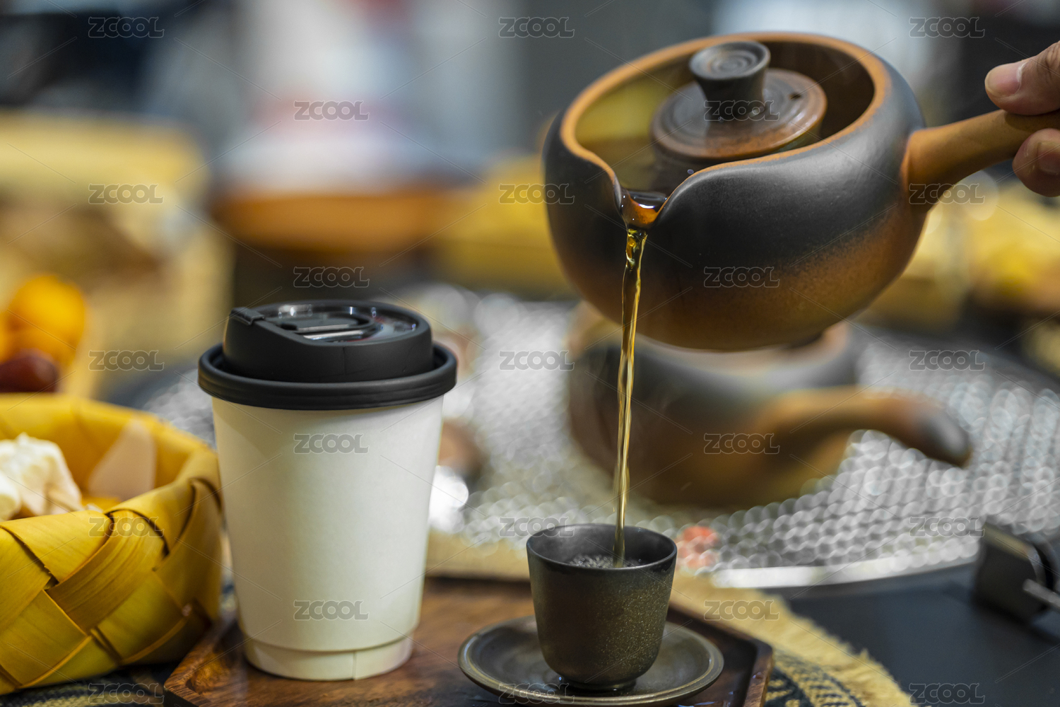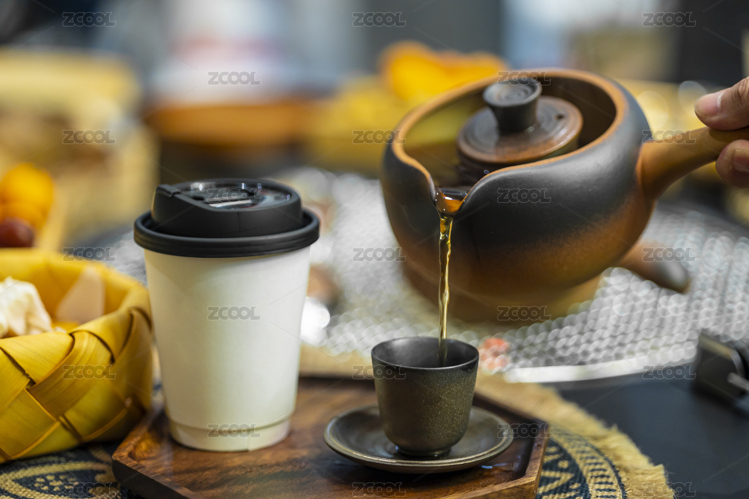 日式极简保温咖啡壶和盛有咖啡的骨瓷咖啡杯
