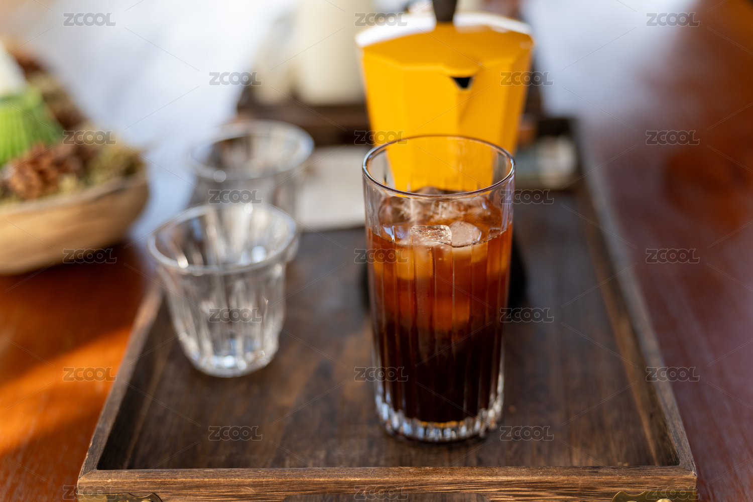 夏天里木桌子上放在纯手工制作的酸奶和冰美式咖啡