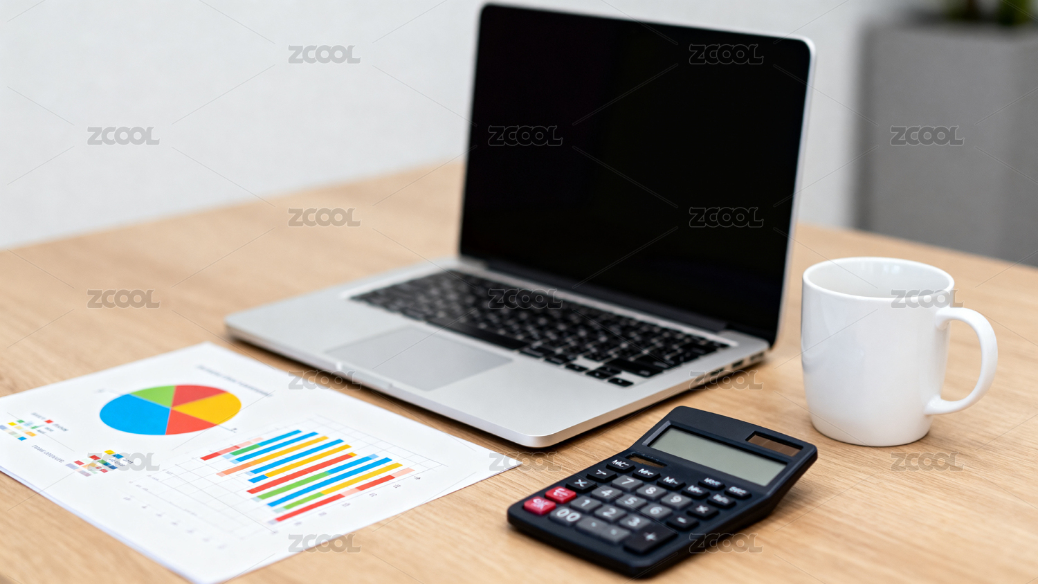 简洁桌面摆着,电脑计算器钢笔和散开的文件图表