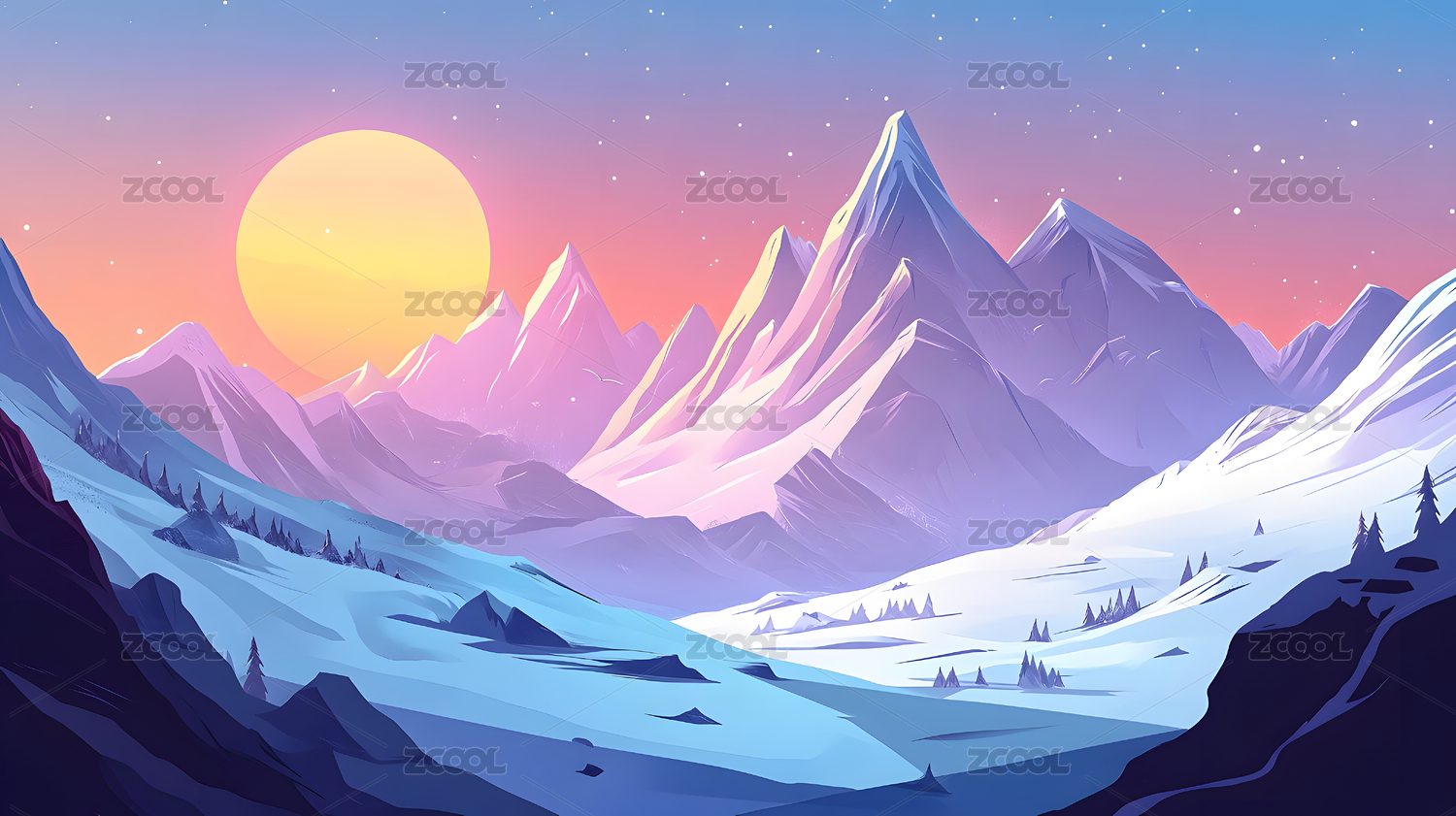 青绿山水,山水画,冬天,雪,夜晚,山,河流,树,月光,月亮