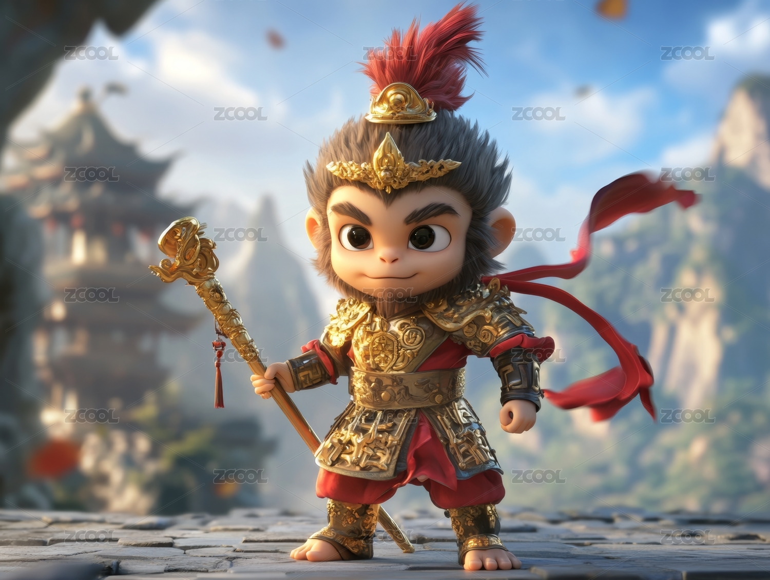 手拿金箍棒的可爱孙悟空3D卡通立体插画