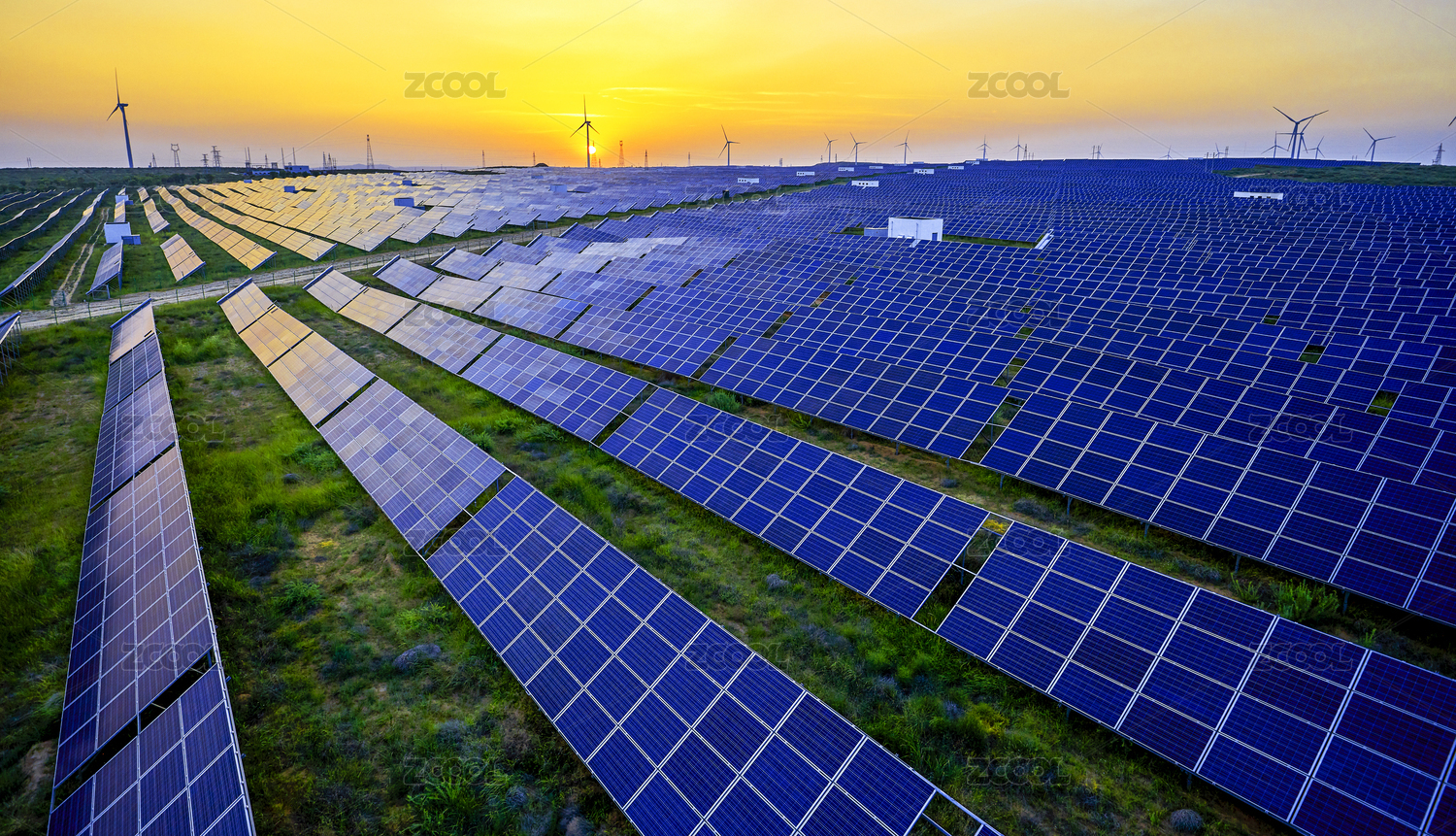 航拍日出时分的太阳能光伏电池面板