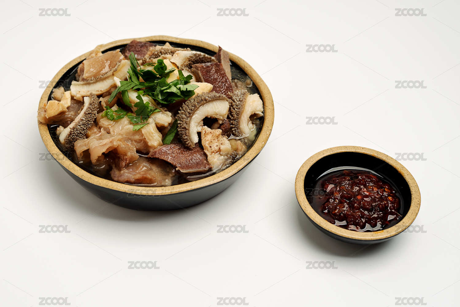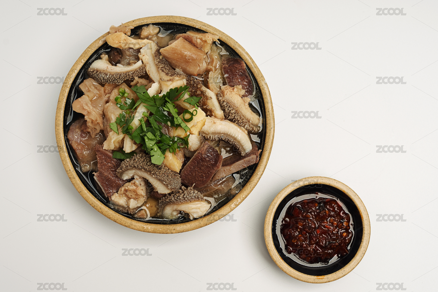 放在白色桌面上的中国广东风味美食——一碟牛杂配酱料
