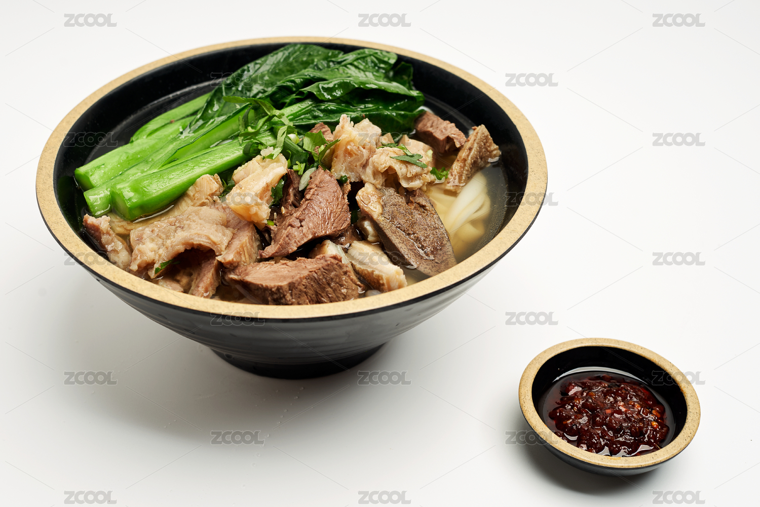 放在白色桌面上的中国广东风味美食——一碟牛杂,一碗清汤和一份辣酱
