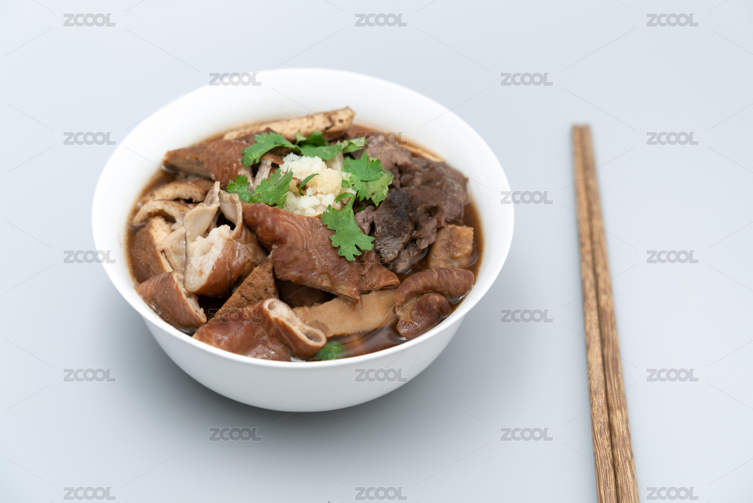 放在白色桌面的一碗中国广东美食——牛杂汤粉