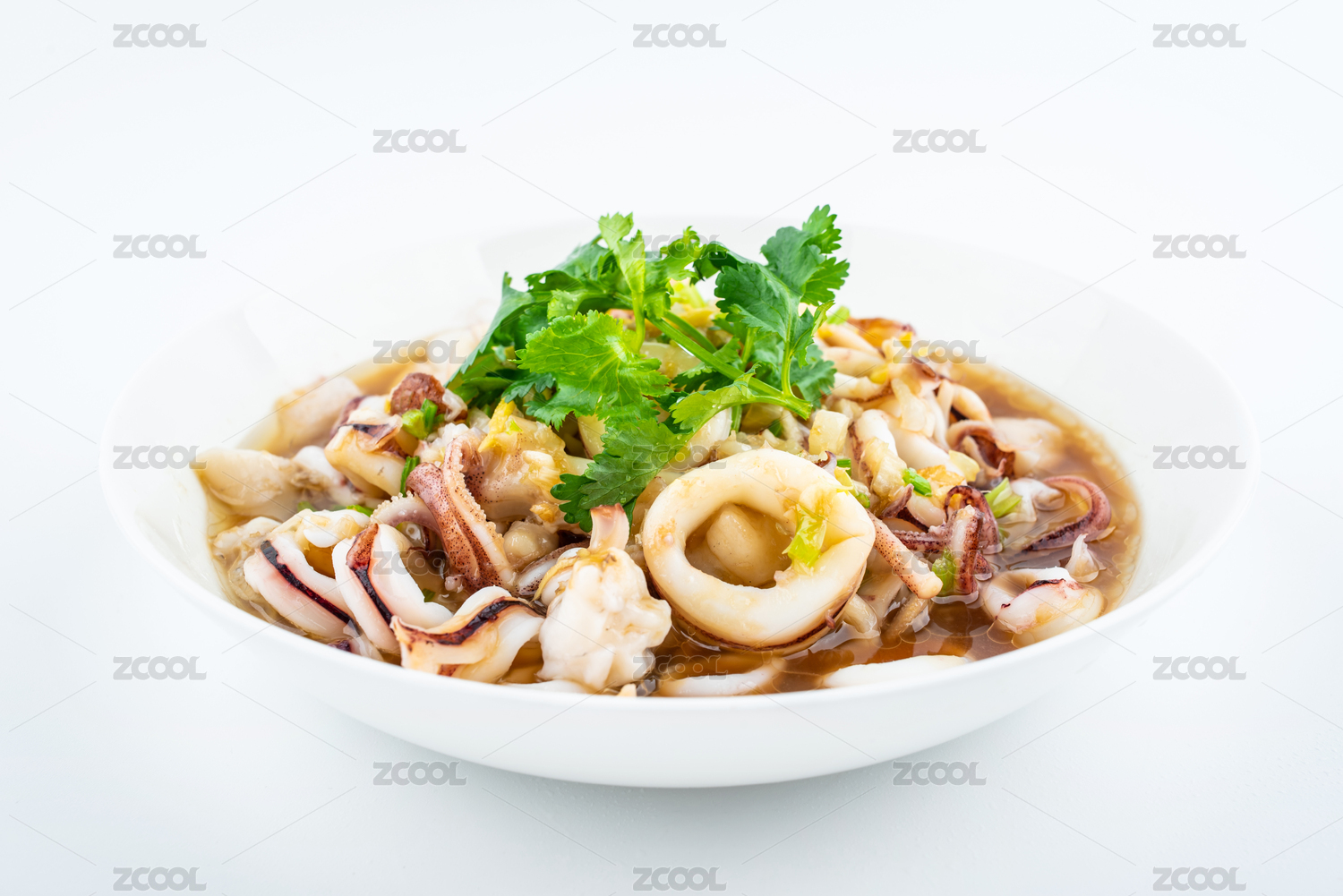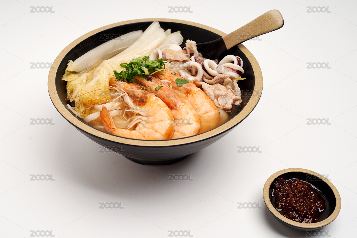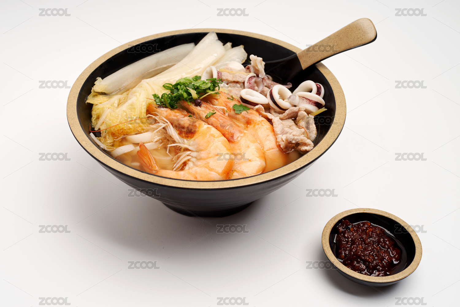 放在白色桌面上的一碗中国广东风味美食——海鲜汤粉