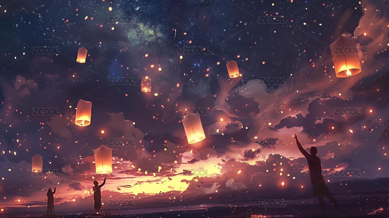 一家人,夫妻,拥抱,灯笼,漫天,孔明灯,幸福,团聚,中秋,节日