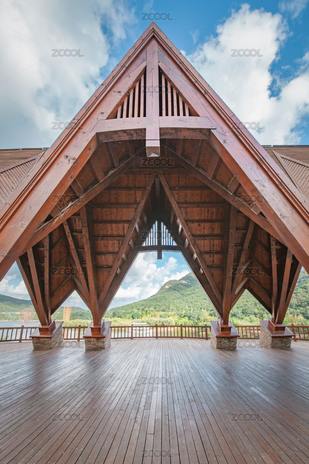 中国辽宁大连西山棠梨湖公园亭子里看山水