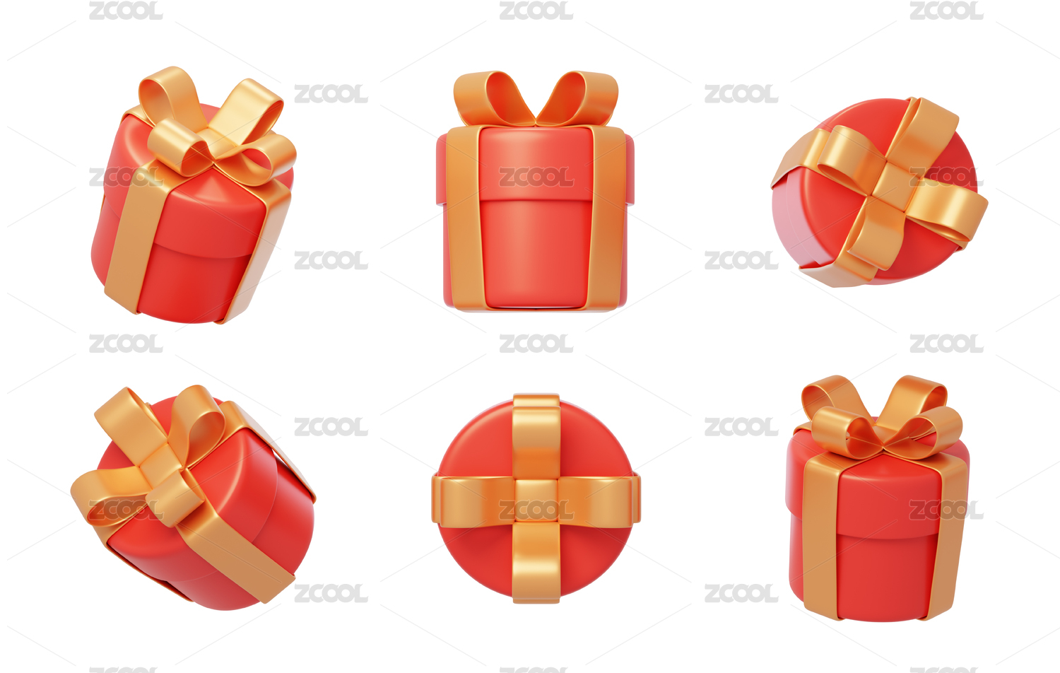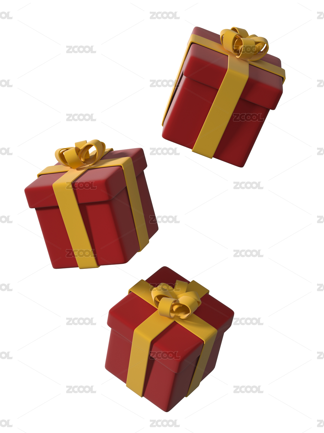 3D渲染漂浮三个黄色丝带红色包装礼物