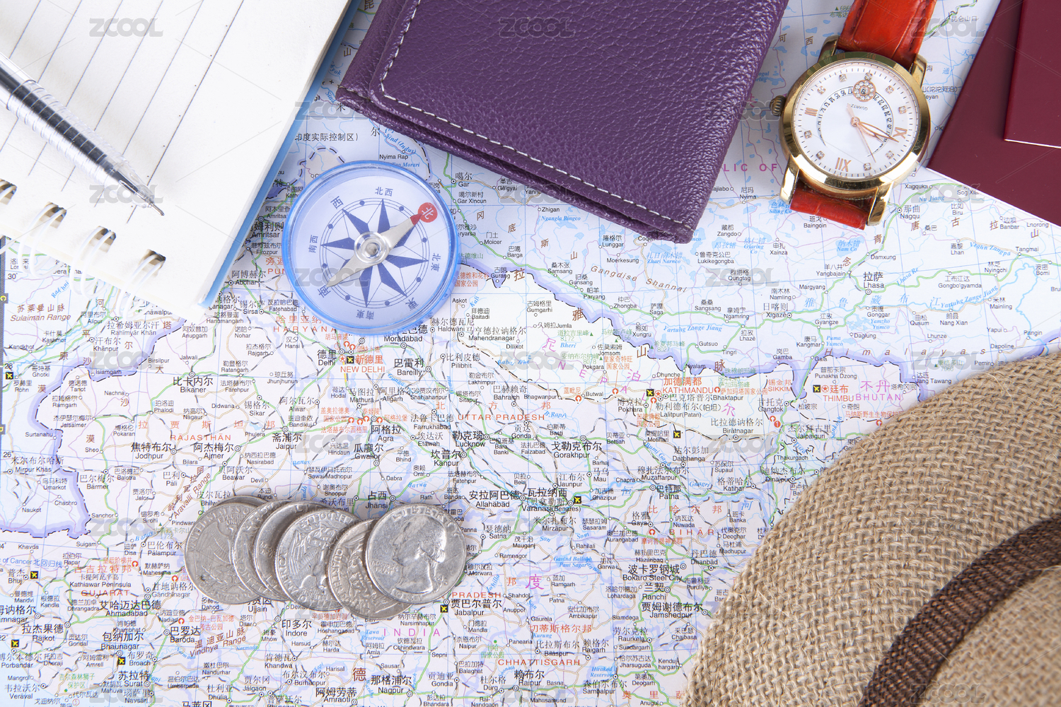 世界地图背景的各种外国货币平铺集合俯拍局部特写
