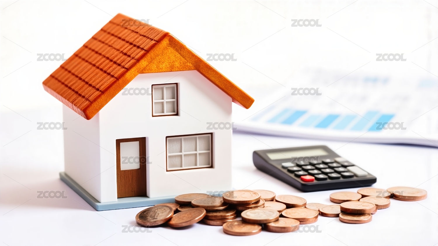 中国传统算盘上放着一袋美元硬币和一个小房子模型