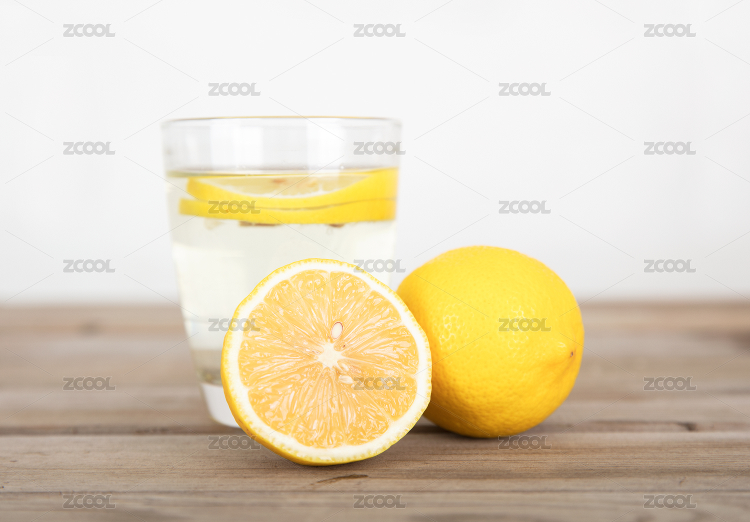 一杯柠檬水及杯子旁边一个完整的柠檬和一半切开的柠檬