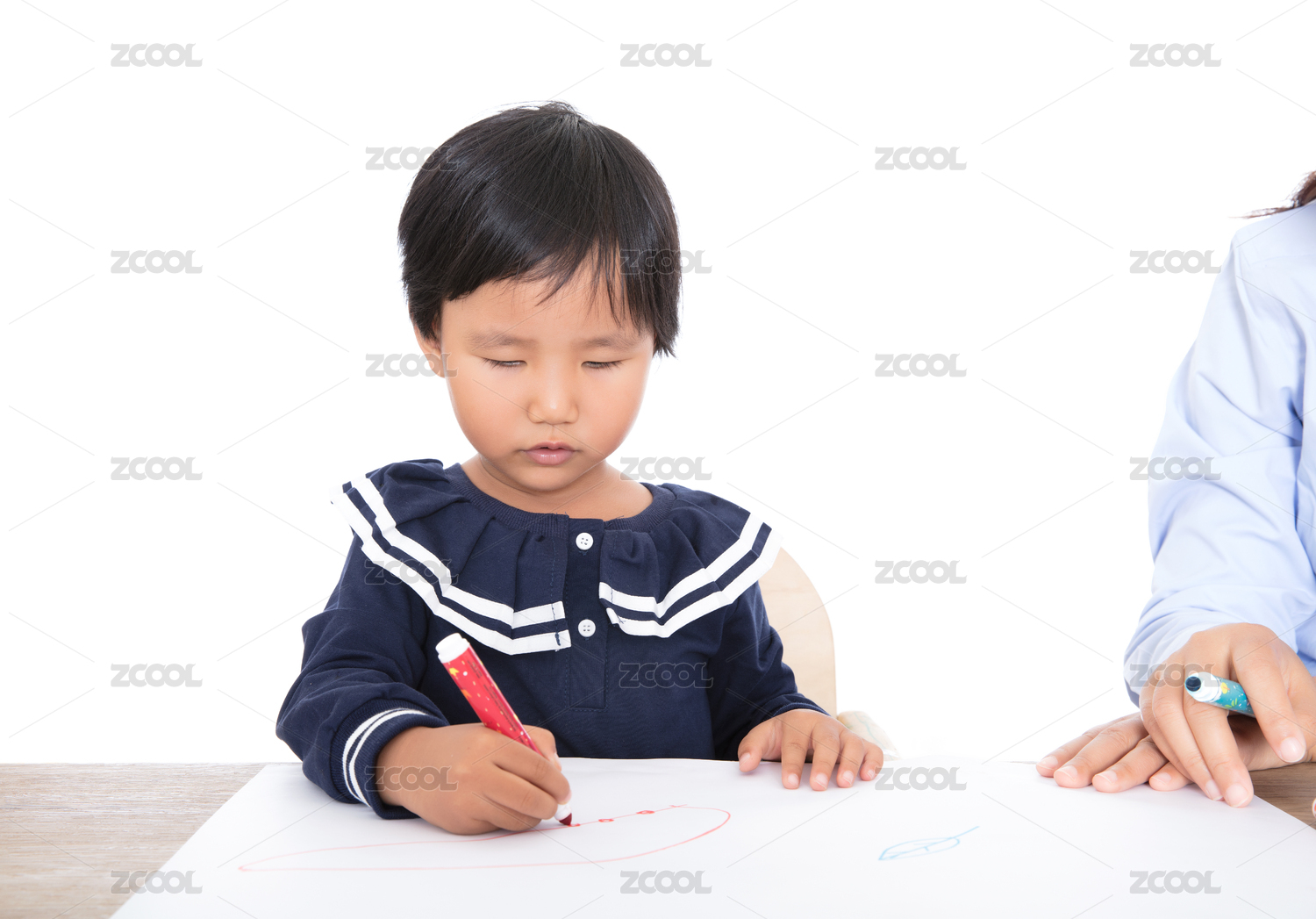 白背景前的桌子上小女孩在老师的指导下练习画画