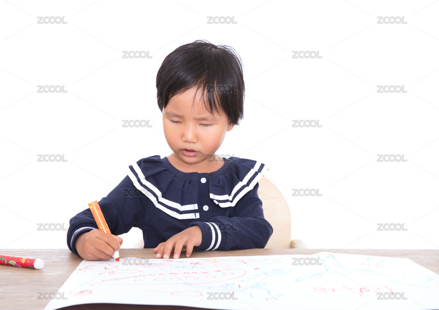 白背景前可爱的中国小女孩在认真的画画
