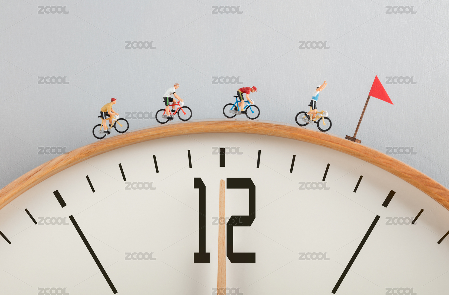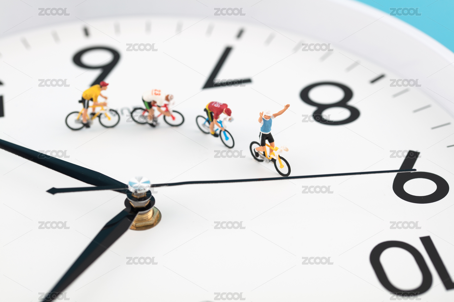 时钟微缩创意冲刺和时间竞赛的自行车手