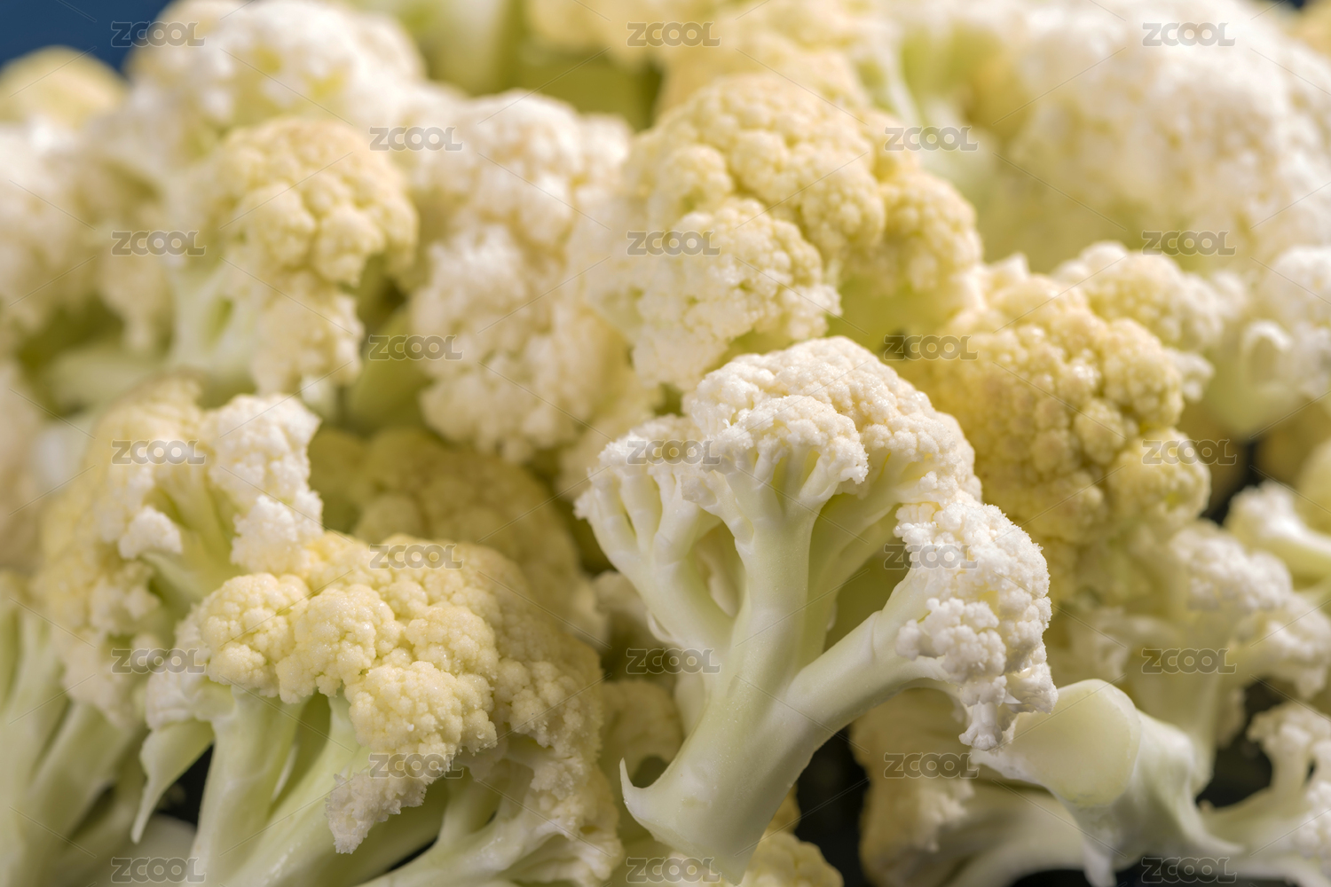 盛放在蓝色碟子里的菜花摆放在桌面上