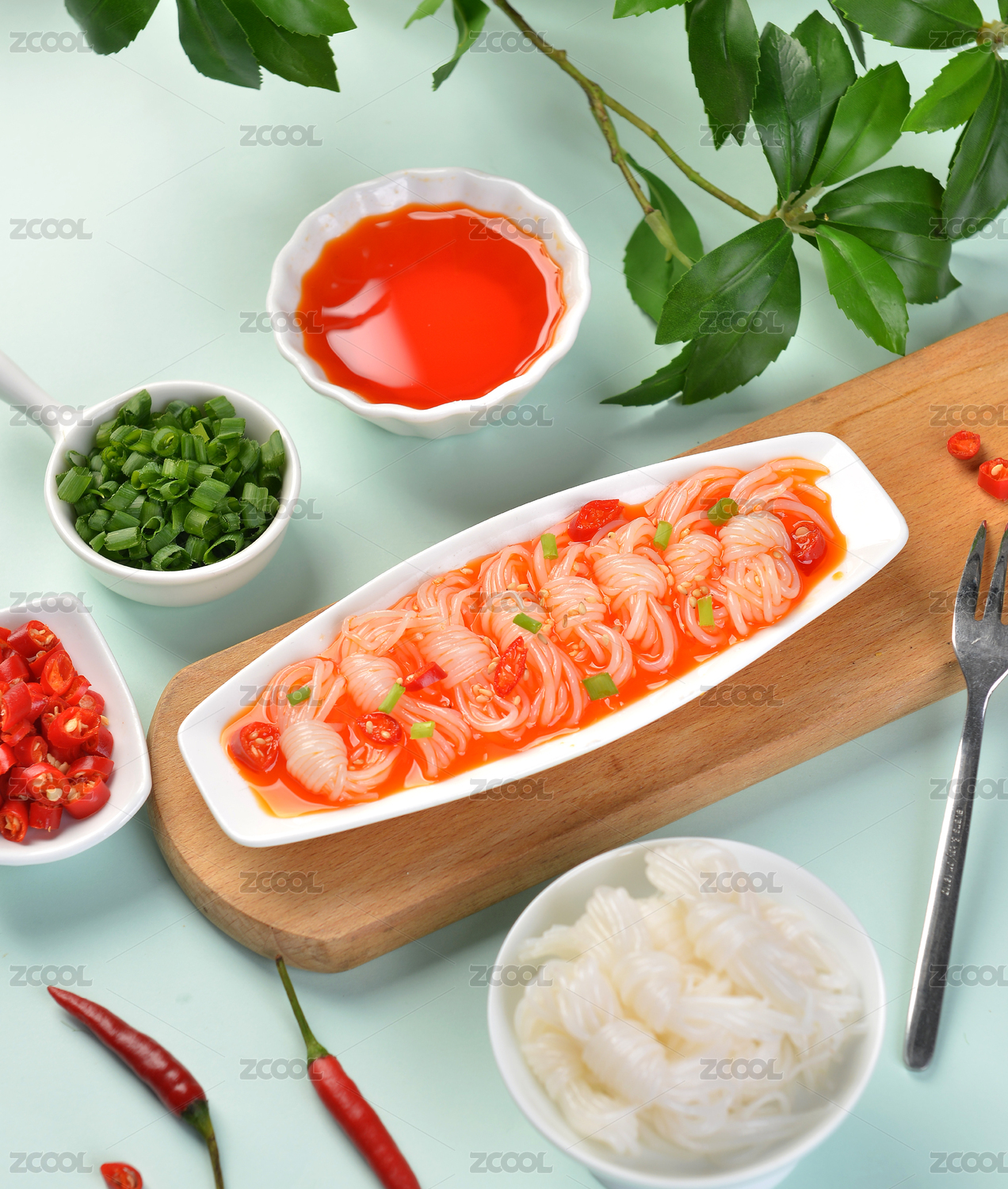木桌上餐具里摆放的魔芋丝