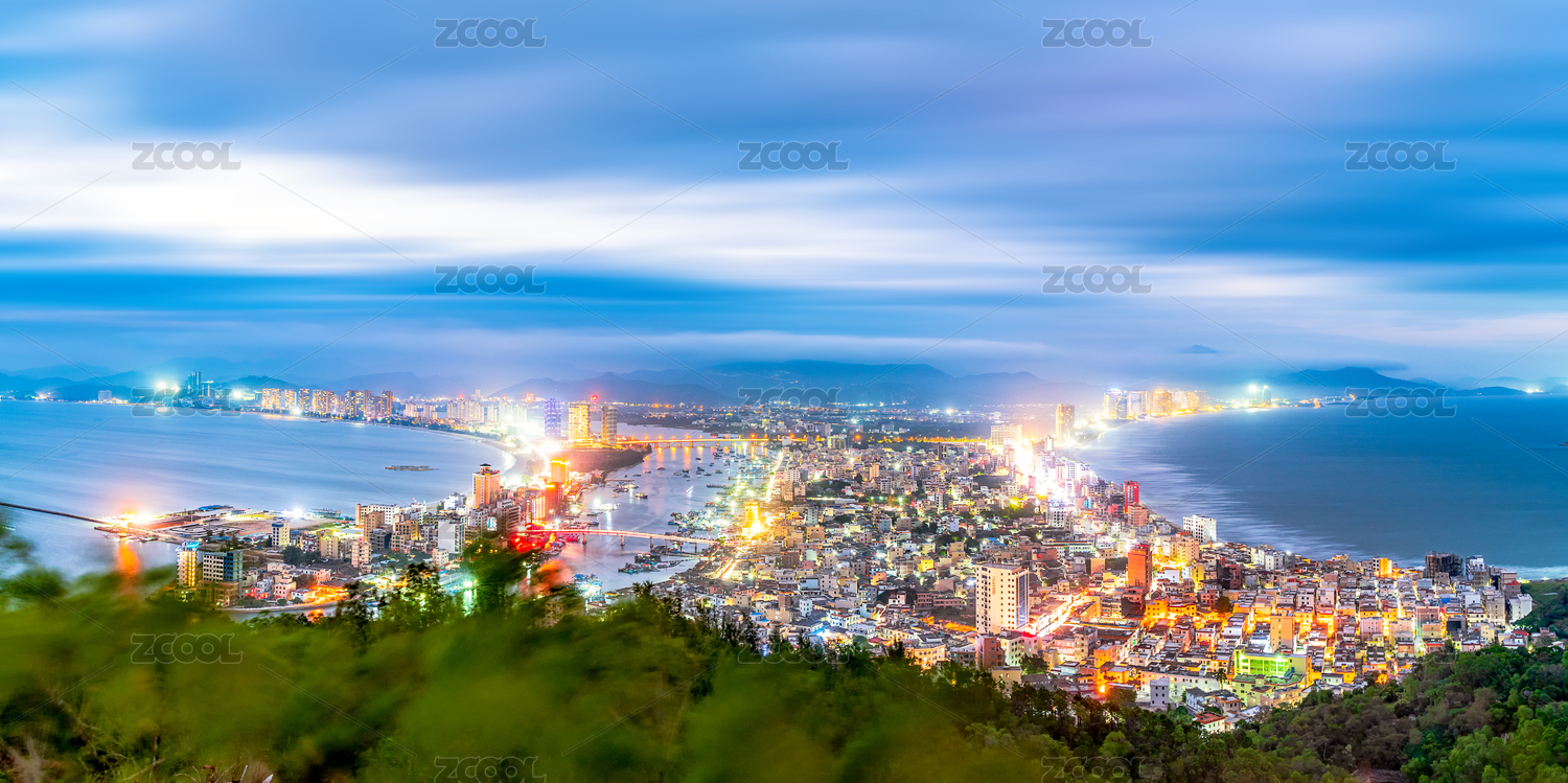中国广东惠州惠东双月湾傍晚时的蓝调全景景观