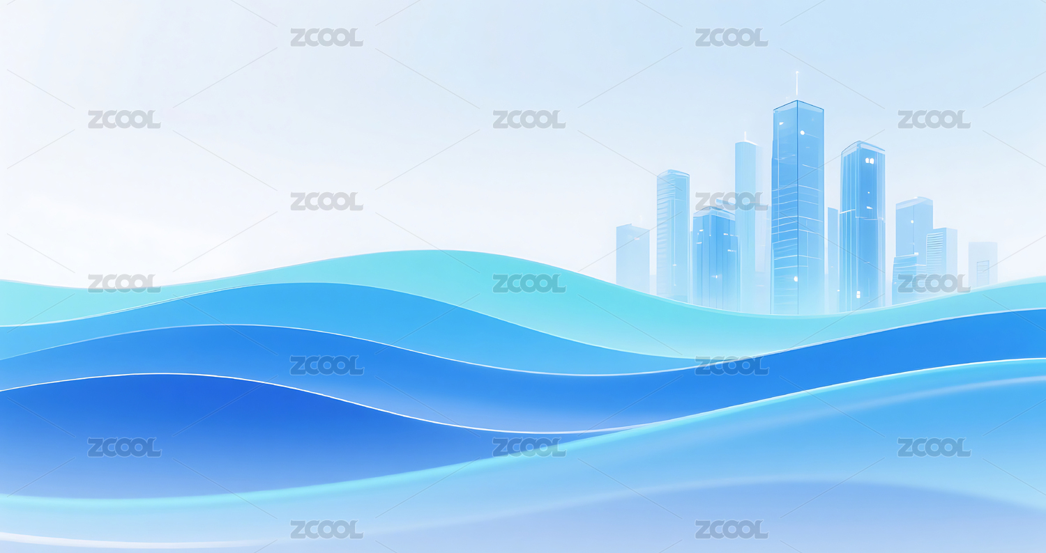 流畅的蓝色渐变波浪线条玻璃城市建筑