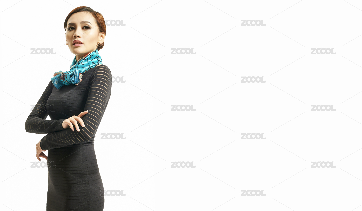 美丽的亚洲空姐穿着黑色紧身服装在白色背景