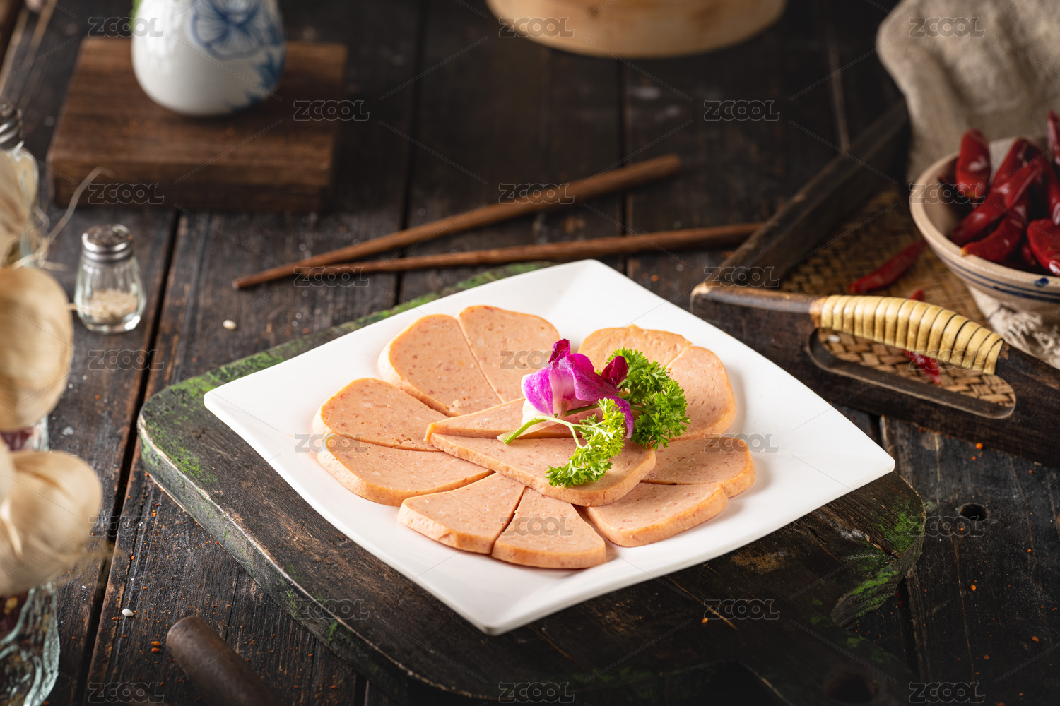 木桌上白盘里的重庆火锅菜品梅林午餐肉